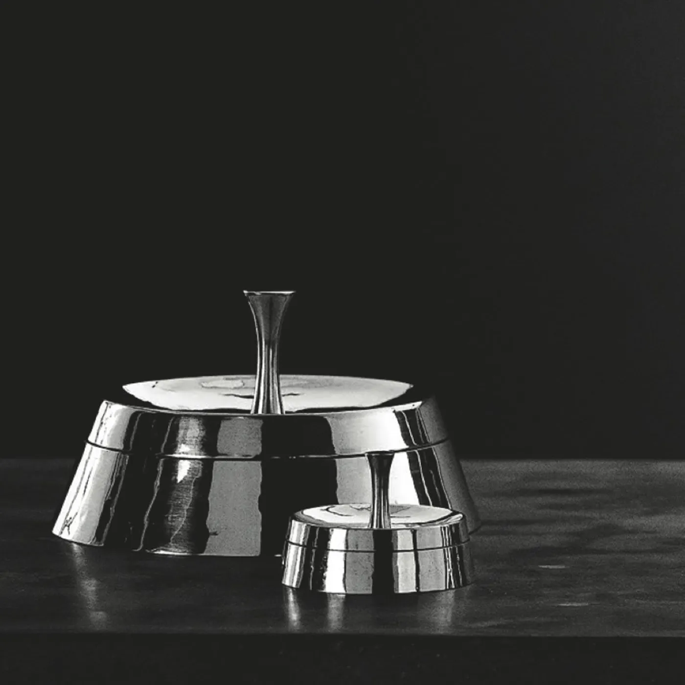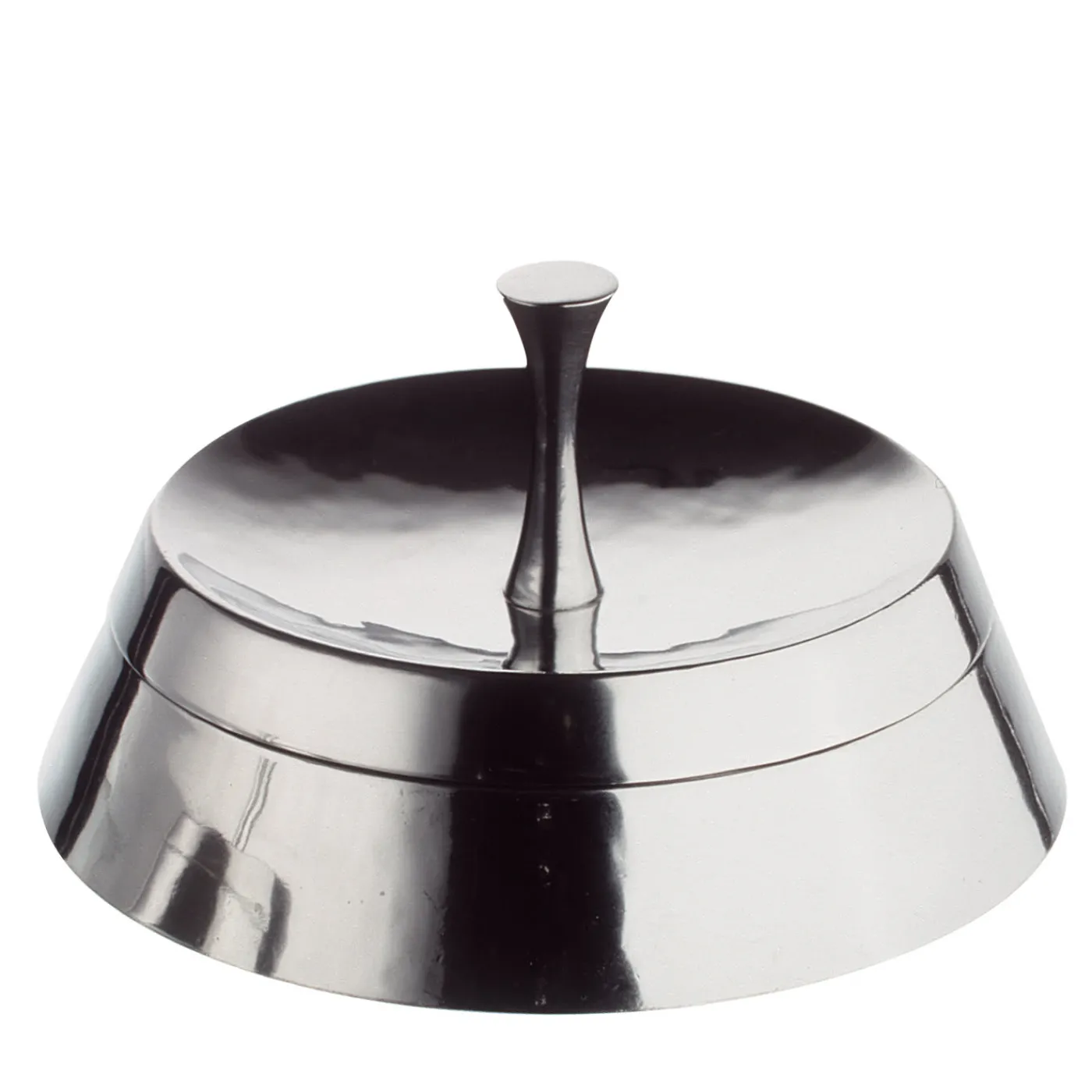 Disegnato da Giovanni Levanti in edizione limitata per il Progetto Metallia, questo splendido cofanetto sarà perfetto per custodire piccoli gioielli e ninnoli preziosi, conferendo a qualsiasi vanità o credenza una sottile raffinatezza. Testimonianza di un’artigianalità raffinata, è realizzato in peltro rifinito in una tonalità argento specchiato. La sua silhouette leggermente conica è arricchita da un coperchio concavo e da un alto pomello.