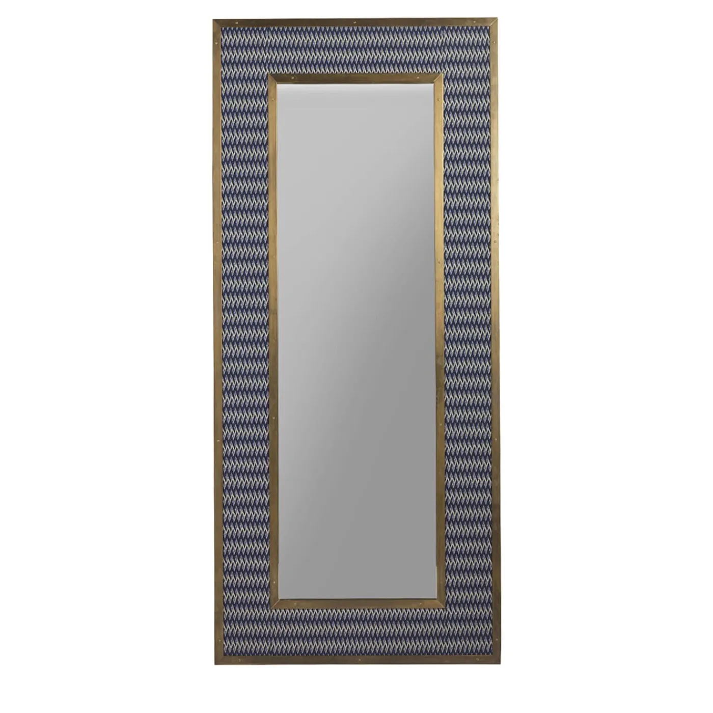 Questo splendido specchio rettangolare è un esercizio di eleganza nelle finiture e di valore sartoriale. Delineata da luminosi profili in ottone con finitura naturale, la cornice sfoggia un raffinato rivestimento in tessuto che ipnotizza con il suo ampio motivo a zig-zag che emerge da un rassicurante sfondo blu. Questo pezzo sarà un’aggiunta superba agli arredi di ispirazione vintage e a quelli moderni.
