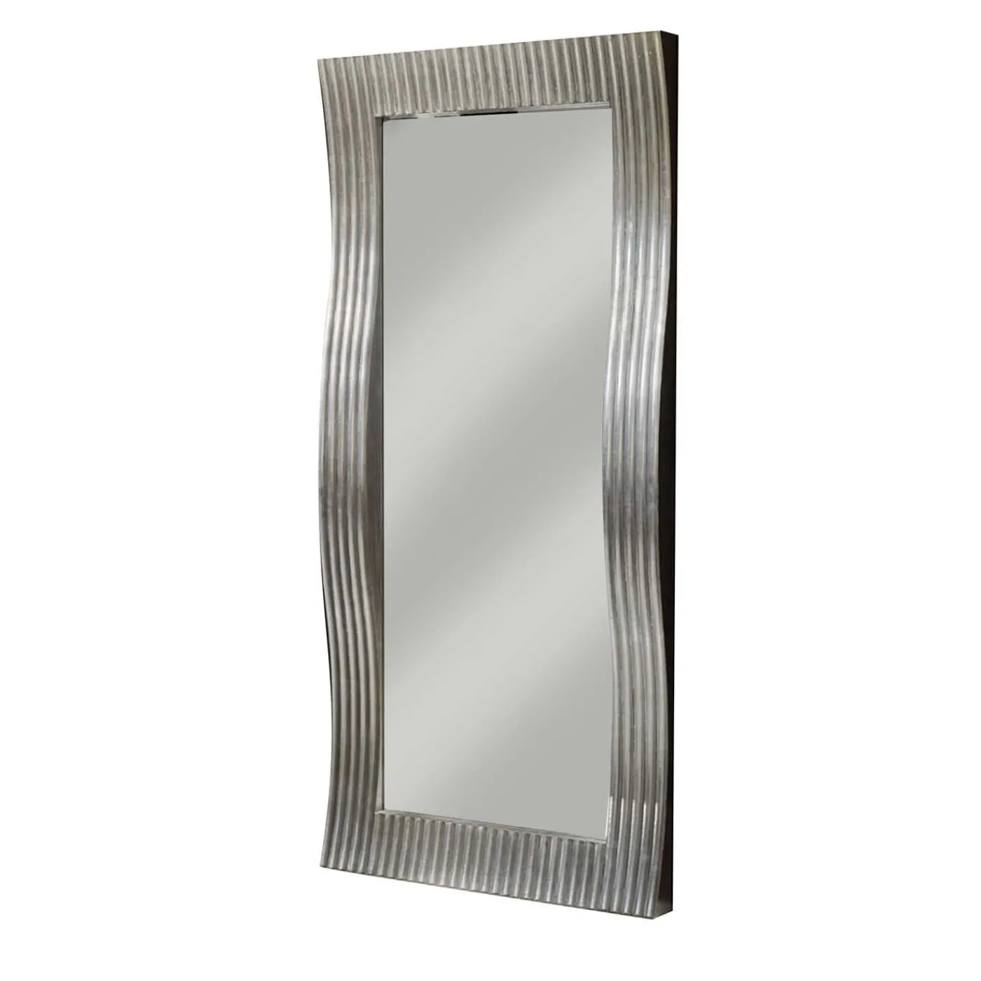 Questo specchio presenta una cornice curva con un motivo a onde. In combinazione con la superficie riflettente dello specchio, crea una sensazione di movimento dinamico che ricorda una casa dei divertimenti estremamente elegante e sofisticata. La sua forma lunga, verticale e a figura intera lo rende perfetto per un ingresso o una camera da letto.