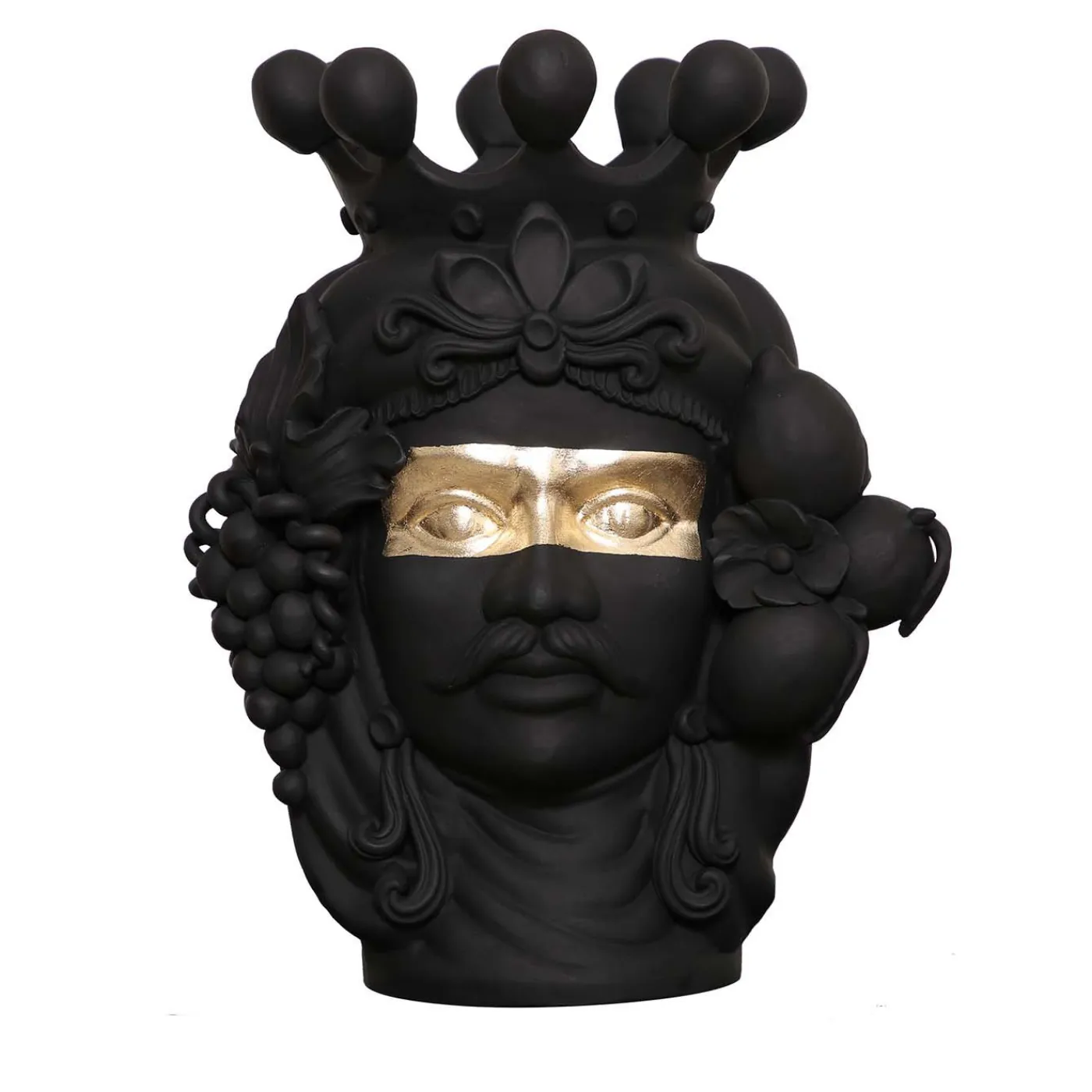 Questo vaso antropomorfo raffigurante un moro è interamente realizzato in ceramica dipinta a mano con un tradizionale smalto nero opaco. La bellezza di questo pezzo si rivela negli ornati dettagli decorativi del maestoso copricapo, della corona e dei capelli pieni di frutta e nello sguardo accattivante, evidenziato da un audace pannello di lamina d’oro che rivela i sorprendenti occhi. La lamina d’oro spicca sulla finitura nera opaca per un contrasto visivo affascinante. Il vaso non può essere riempito d’acqua.