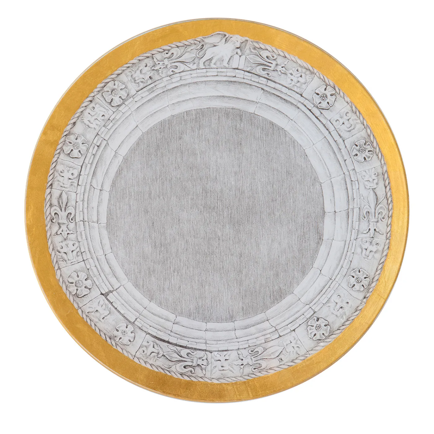 Il sottopiatto Frari, appartenente alla collezione Veneziana, trae ispirazione dall’eleganza architettonica di Venezia. Il suo design, ispirato al rosone della Basilica di Santa Maria Gloriosa dei Frari, reinterpreta la geometria gotica con un linguaggio contemporaneo, arricchito da dettagli in grafite e foglia d’oro. Realizzato in vetro temperato, presenta motivi raffinati impreziositi da accenti in oro 24 carati che riflettono la luce in maniera cangiante a seconda della prospettiva. Ideale come elemento scenografico per la tavola, si presta anche a essere esposto come opera decorativa a parete o su piedistallo.