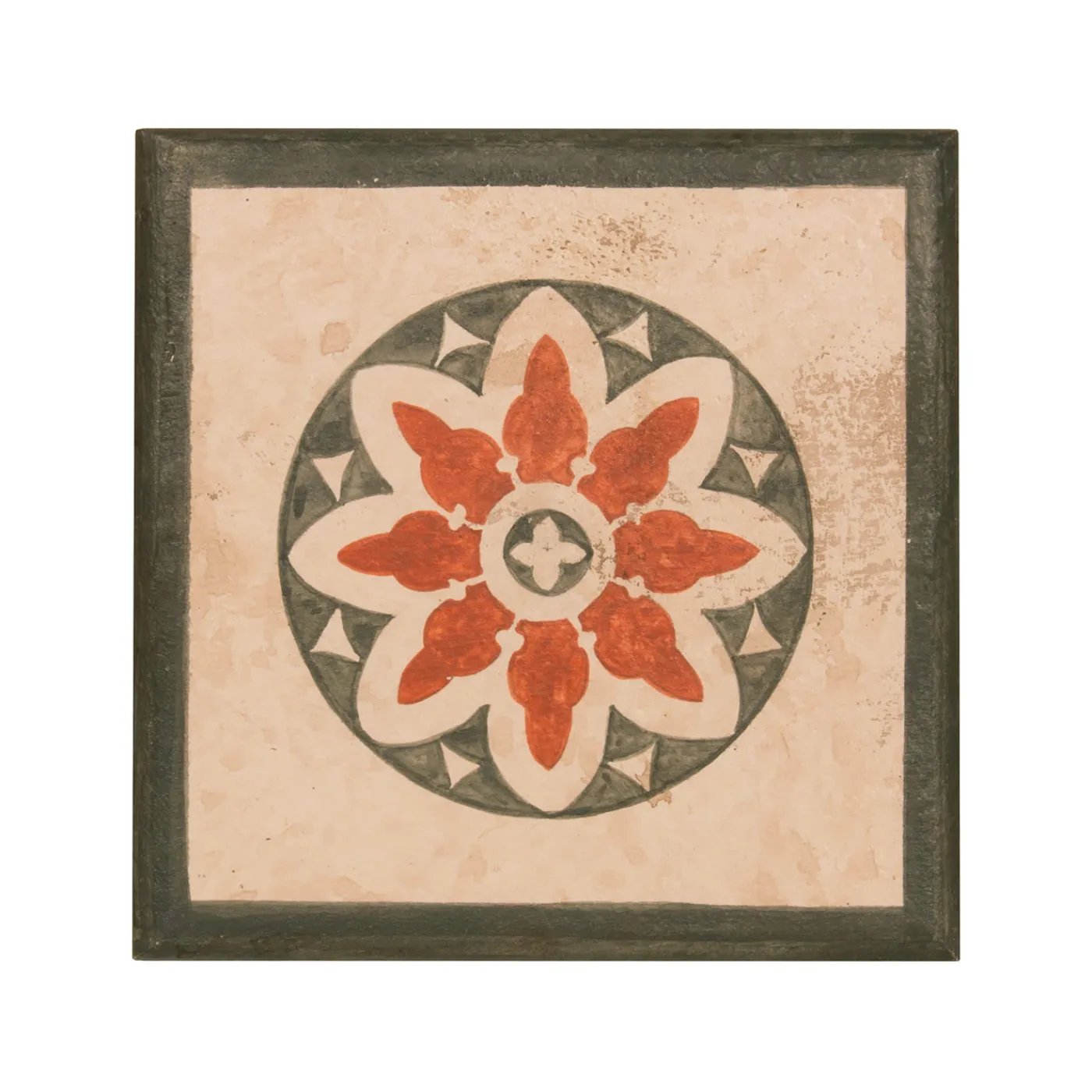 Utilizzata per riporre i gioielli sul comò della camera da letto, i ricordi sul tavolino del salotto o la cancelleria sulla scrivania dell’ufficio, questa elegante scatola aggiungerà fascino e funzionalità a qualsiasi ambiente. Realizzata in legno di recupero con tecniche artigianali tradizionali, la silhouette quadrata è dipinta a mano a tempera acrilica bianca con una texture marmorizzata in stile “encausto veneziano”. Il coperchio presenta un motivo floreale stilizzato con petali rossi incorniciati da un cerchio verde e un bordo verde coordinato. È dipinto con pigmenti naturali e rifinito con un rivestimento protettivo di cera d’api.