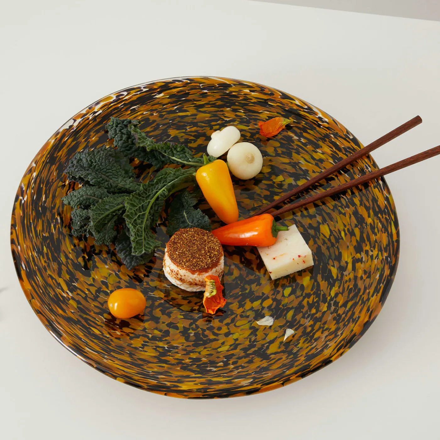 Questo pezzo unico presenta un accattivante motivo di marroni caldi e tonalità ambrate, che cattura l’essenza dell’arte vetraria italiana contemporanea. La profondità e la ricchezza del centrotavola invitano a creare un’atmosfera confortante, mentre i suoi accenti vibranti di ambra conferiscono un tocco vivace. Il centrotavola Leopardo incarna un’eleganza che si armonizza perfettamente con diversi stili di arredamento. Progettato per contrastare le forme minimaliste con i motivi massimalisti, questo prodotto non è solo un elemento funzionale, ma anche un elemento d’arredo mozzafiato. Ogni pezzo è unico e, a causa della lavorazione a mano, possono verificarsi lievi variazioni.