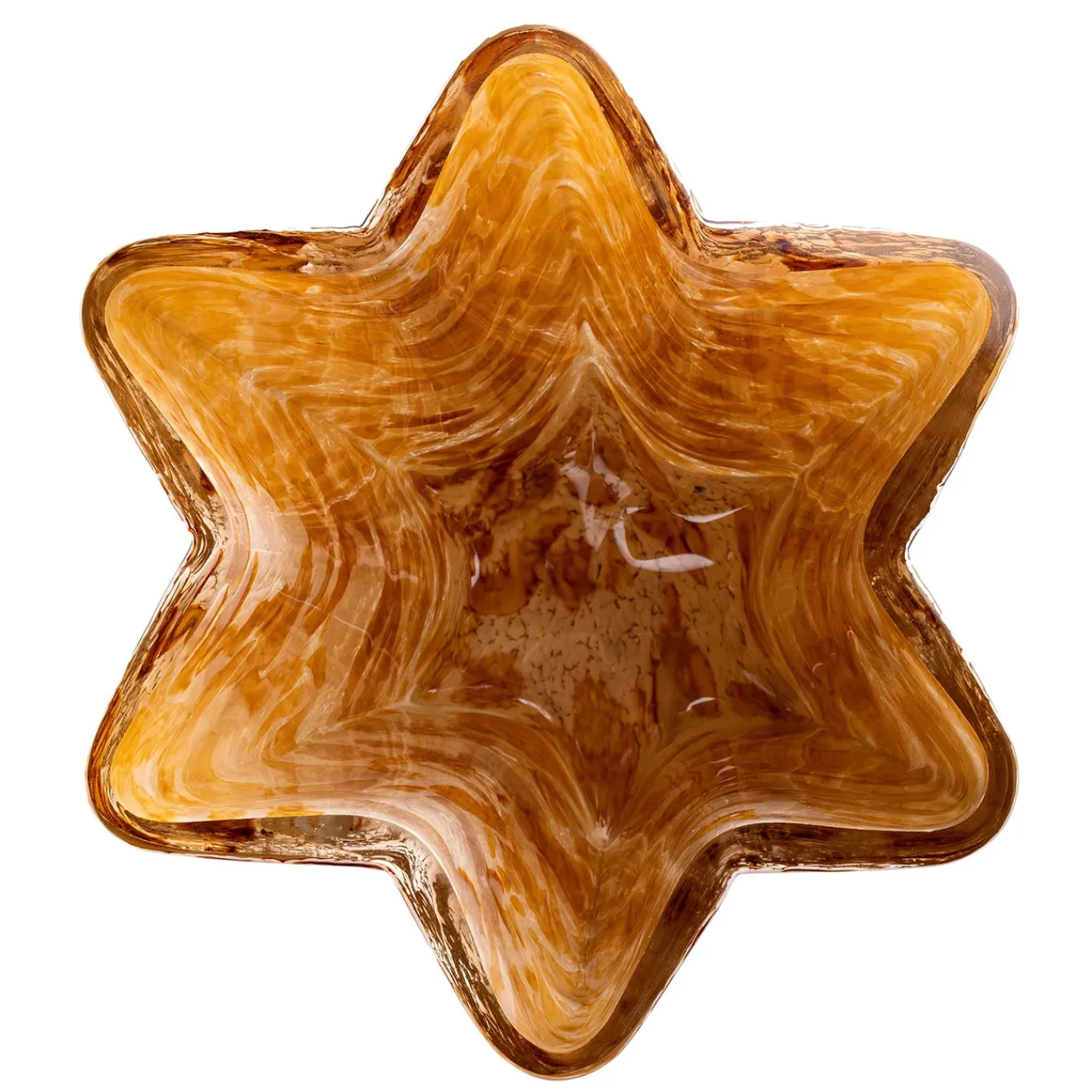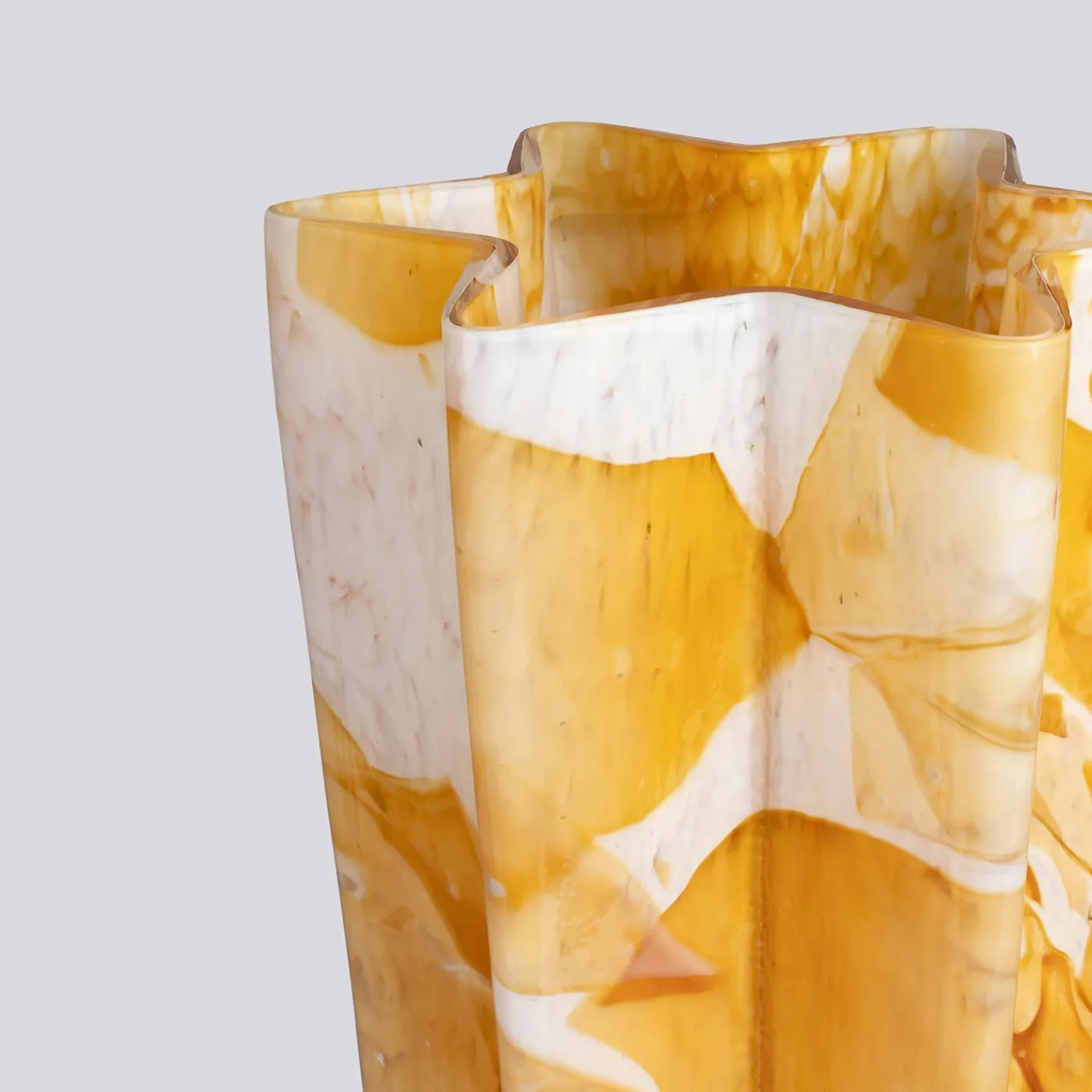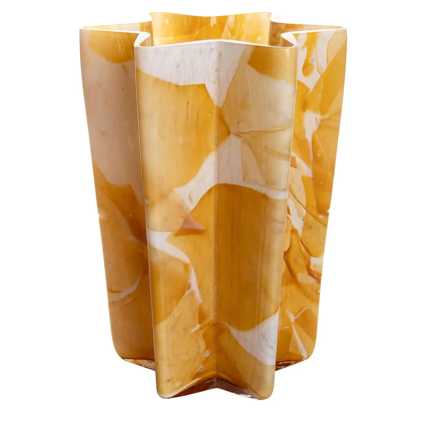 Il vaso a secchiello Karkadè presenta un’inconfondibile silhouette a forma di stella con un’accattivante miscela di toni ambrati e avorio. Questo pezzo presenta frammenti di vetro sapientemente fusi, con un effetto caldo e marmorizzato che aggiunge profondità e carattere. Il suo design unico conferisce un accento elegante e intrigante a qualsiasi interno, fungendo da sofisticato centrotavola che esalta l’ambiente con un’arte senza tempo e uno stile raffinato. Ogni pezzo è unico e, a causa della lavorazione a mano, possono verificarsi lievi variazioni.