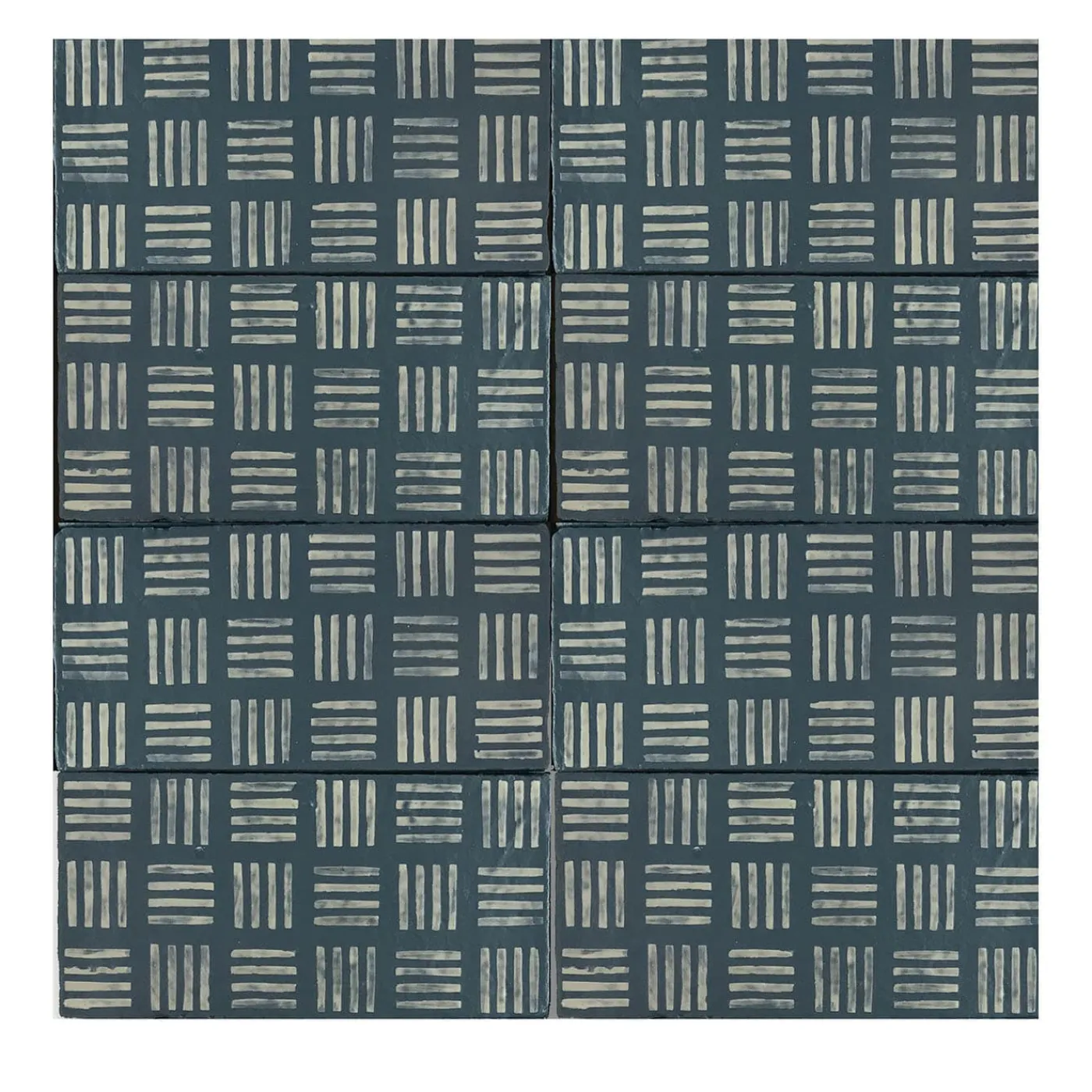 Decorato a mano con un motivo geometrico stilizzato su uno sfondo blu opaco, questo elegante set di 50 piastrelle in cotto fonde la tradizione con un carattere senza tempo. Ogni piastrella rettangolare misura 20 x 10 x 1,3 cm (LxLxH). Disponibile in altri motivi e colori e in altre combinazioni di set, consultare il catalogo Artemest per le opzioni.