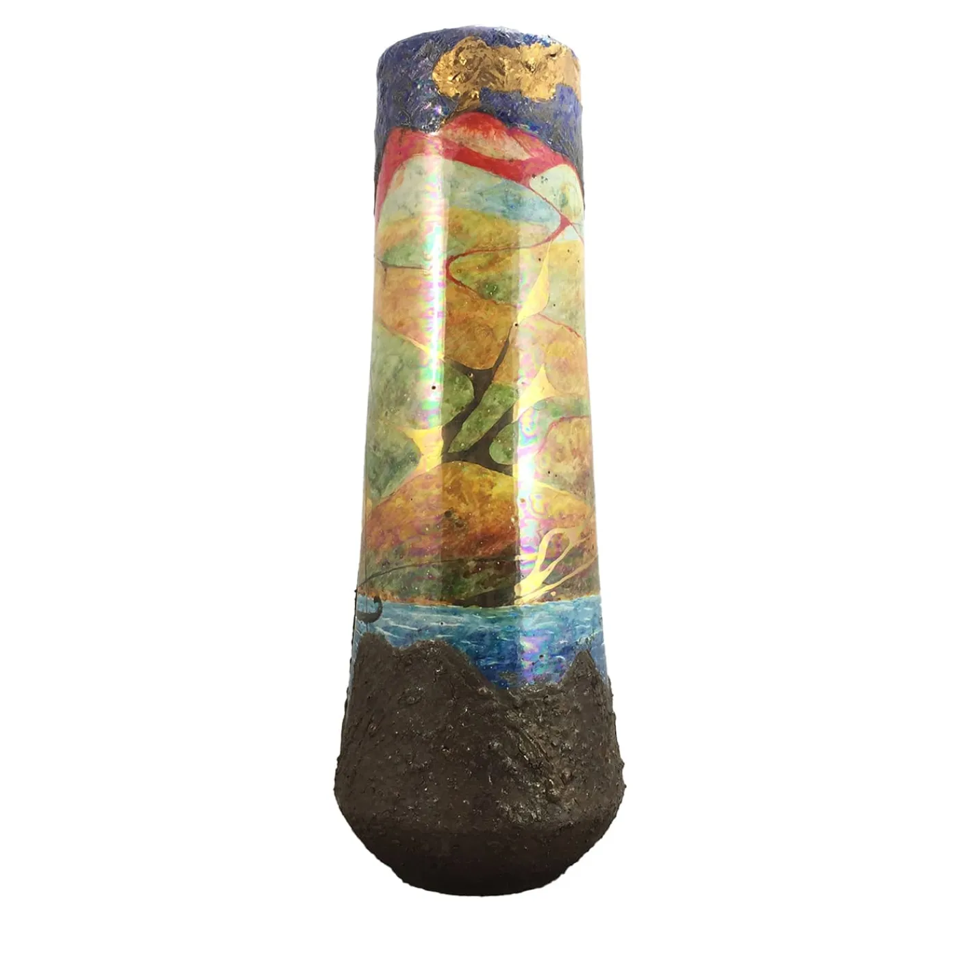 L’essenza dell’Etna è magistralmente tradotta in questo vaso di ceramica, che brilla di riflessi metallici grazie al processo di terza cottura. Il dipinto immerge lo spettatore in un paesaggio dinamico, dove i verdi e i blu vividi contrastano con il nucleo ardente del vulcano. Le pennellate vorticose suggeriscono il movimento del vento e della lava, rendendo la scena viva con i ritmi della terra stessa. Trovate altre straordinarie varianti nel catalogo Artemest.