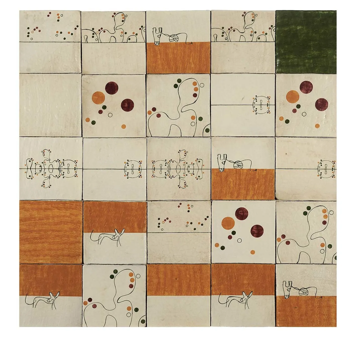 Ricordando le estrose composizioni di Joan Mirò, questo elegante pannello in maiolica aggiungerà un tocco di eleganza a un arredamento moderno o classico. Le 25 piastrelle che compongono il pannello, che fondono la tradizione artigianale con il design moderno, presentano disegni semplici e giocosi di figure e forme che utilizzano una combinazione di 4 colori (arancione, rosso, verde e nero) su uno sfondo avorio. Punto focale di qualsiasi interno, queste piastrelle sono ideali in qualsiasi configurazione come pannello in cucina, in bagno, nella toilette o nel patio.