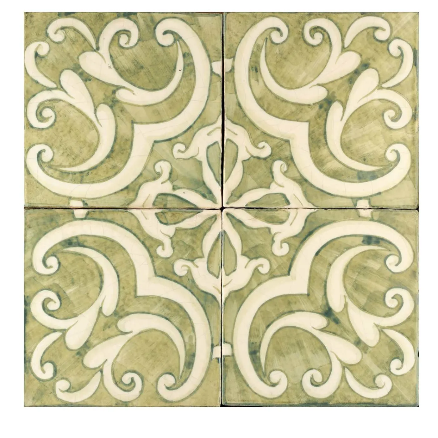 Maestose ed eleganti, queste maioliche fatte a mano saranno un’aggiunta inestimabile all’arredamento di una cucina, di un bagno o di un patio. Interamente dipinte e smaltate a mano, queste piastrelle sono caratterizzate da eleganti motivi di volute e fronde e accenti in avorio su uno sfondo verde muschio, la cui precisione speculare ricorda le forme create da un caleidoscopio. Le piastrelle devono essere applicate senza stuccatura per garantire la continuità del disegno.
