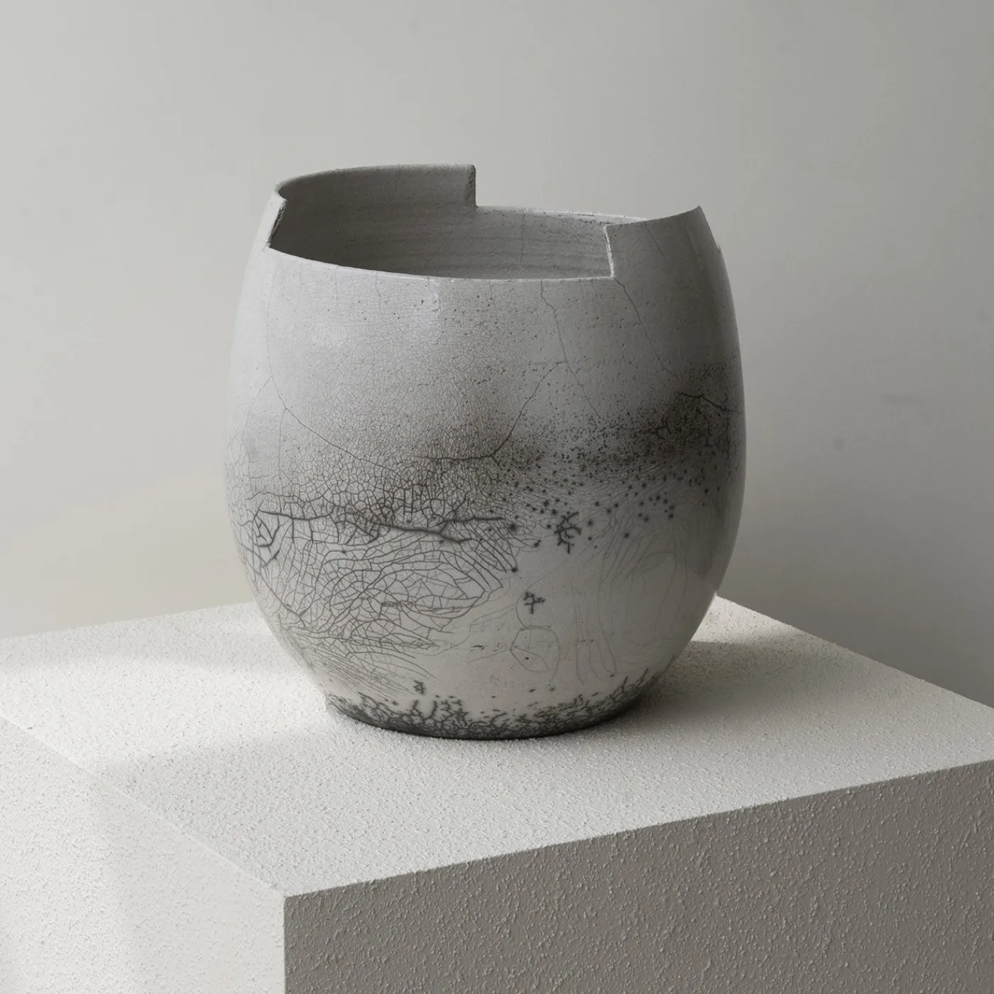 Caratterizzato da tagli netti eseguiti direttamente sulla ruota, il vaso in ceramica trasparente raku cut small incarna un design minimalista ispirato all’estetica giapponese, dove ha origine la tecnica raku. Questo metodo accentua la bellezza della semplicità, creando modelli e toni unici di crepe attraverso effetti di smaltatura e fumo durante la cottura. Abbracciando l’ideale wabi-sabi, il vaso celebra l’imperfezione e il passare del tempo, rendendo ogni pezzo visivamente distinto. Si abbina a interni contemporanei e sereni.