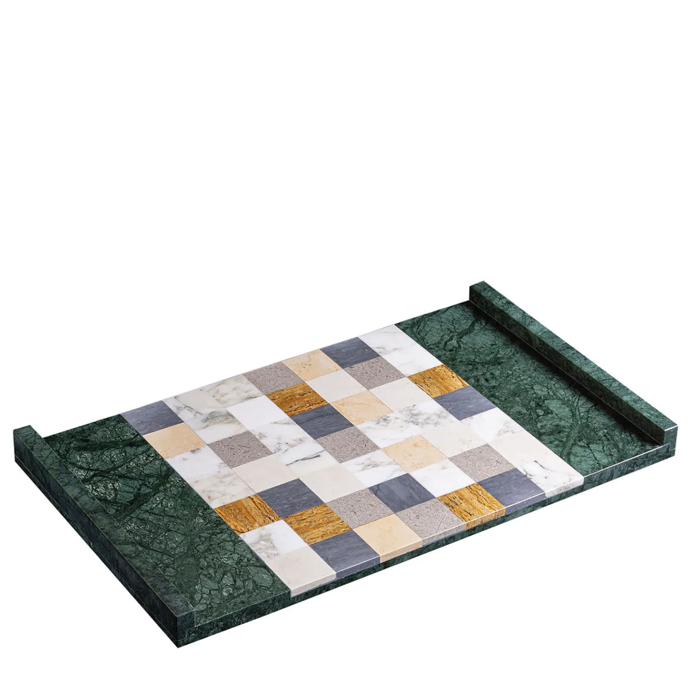 Il centrotavola Sette per sette, disegnato da Luciano Setten, è un sorprendente pezzo rettangolare realizzato in marmo naturale che emana eleganza e raffinatezza. Caratterizzato da un’audace base in Verde Guatemala, questo centrotavola cattura l’essenza del lusso moderno. Il centrotavola presenta una disposizione intricata di piccoli quadrati in vari marmi di lusso, tra cui Carrara Arabescato, Travertino Giallo, Bardiglio e Silvia Oro. Questo design accurato, lucidato con una finitura elegante, introduce un tocco artistico e contemporaneo in qualsiasi spazio. Con un raffinato spessore di 8 millimetri, il meticoloso processo di taglio e assemblaggio garantisce durata e qualità superiore. A causa delle variazioni naturali dei marmi, è possibile che si verifichino lievi differenze di colore e di disegno, per cui ogni pezzo è unico.