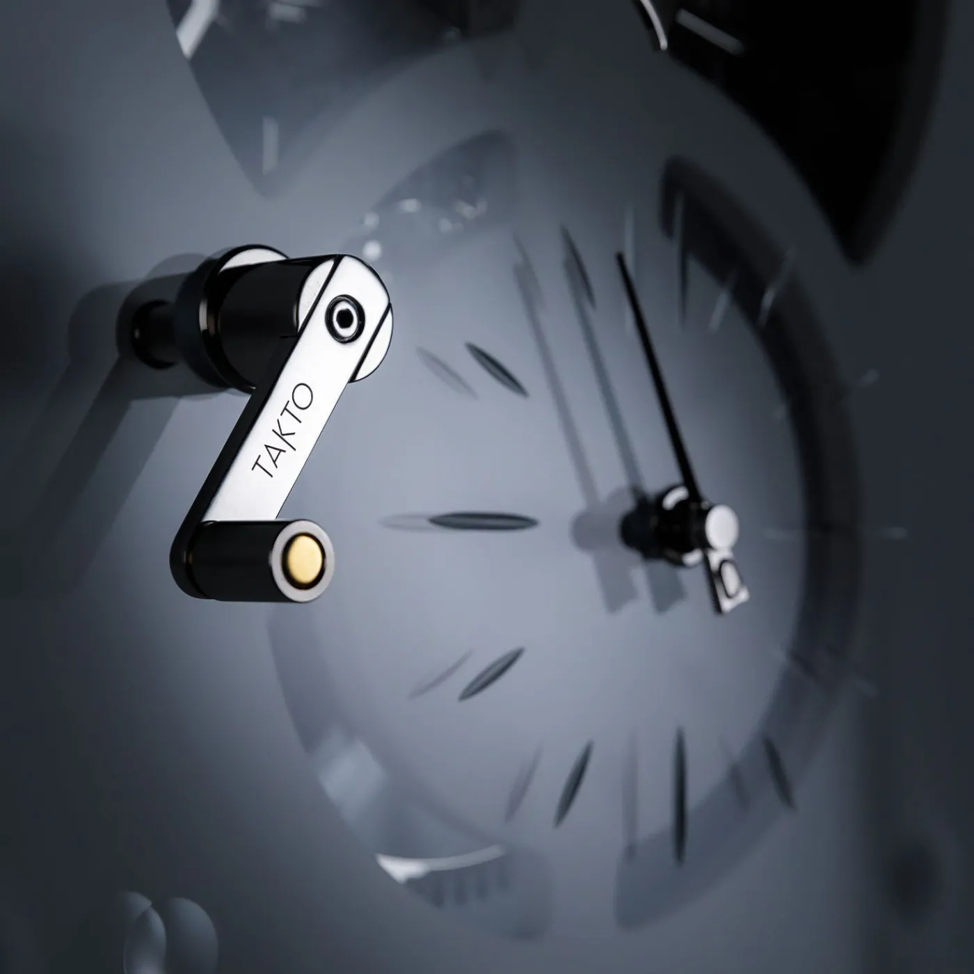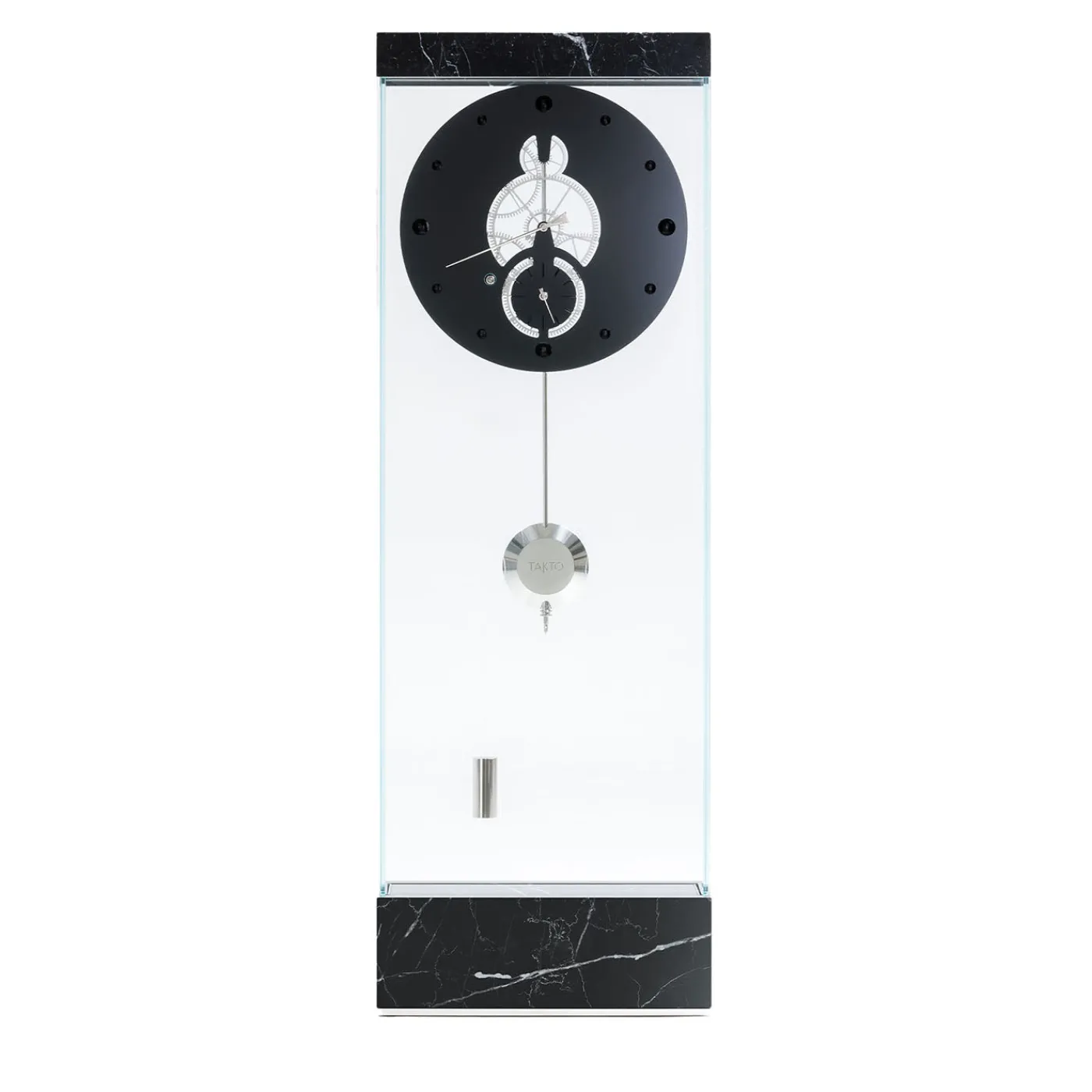 Takto Adagio presenta una base e un telaio in marmo Marquina nero. Il disco del quadrante è fresato da un unico blocco di alluminio e rifinito con guilloché anodizzato nero. La sua struttura in vetro temperato extra-chiaro spesso 15 mm espone indici delle ore e dei minuti finemente incisi e lucidi. Alimentato da un movimento meccanico con un escapement Graham, il meccanismo interno include ingranaggi e pignoni in ottone rivestiti di palladio. Con una riserva di carica di 30 giorni, una frequenza di 3.600/h e un peso di carico di 2,4 kg, TAKTO ADAGIO unisce ingegneria di precisione a un’estetica raffinata.