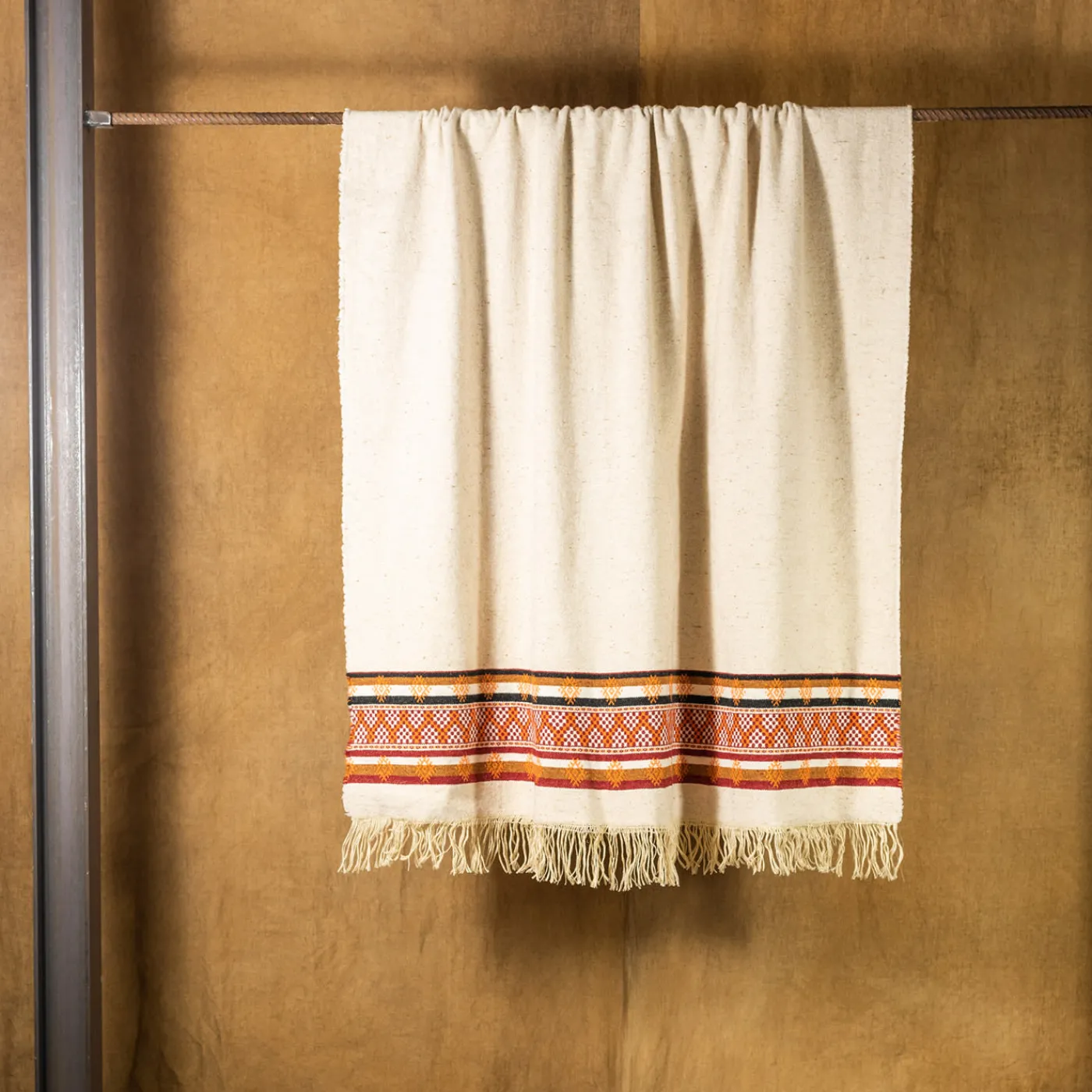 Ipnotizzante nelle sue linee, nei suoi punti e nell’audace palette di colori che evoca caldi scenari esotici, una squisita fantasia contraddistingue questa tranquilla coperta beige con frange. È una soluzione preziosa per aggiungere personalità a divani o poltrone altrimenti monotoni e si offre come una soluzione affidabile in cui accoccolarsi. La sua miscela combina il 49% di lana vergine, il 38% di lino e il 13% di poliammide.