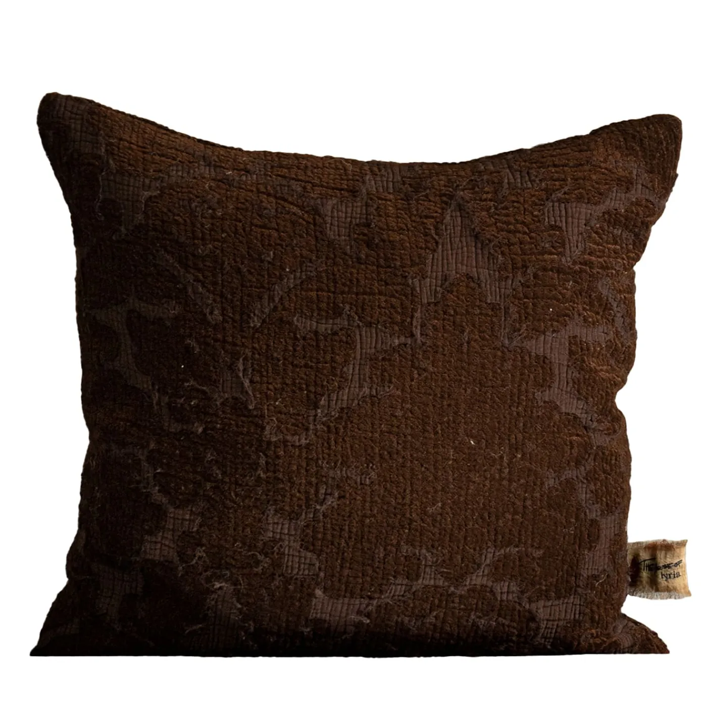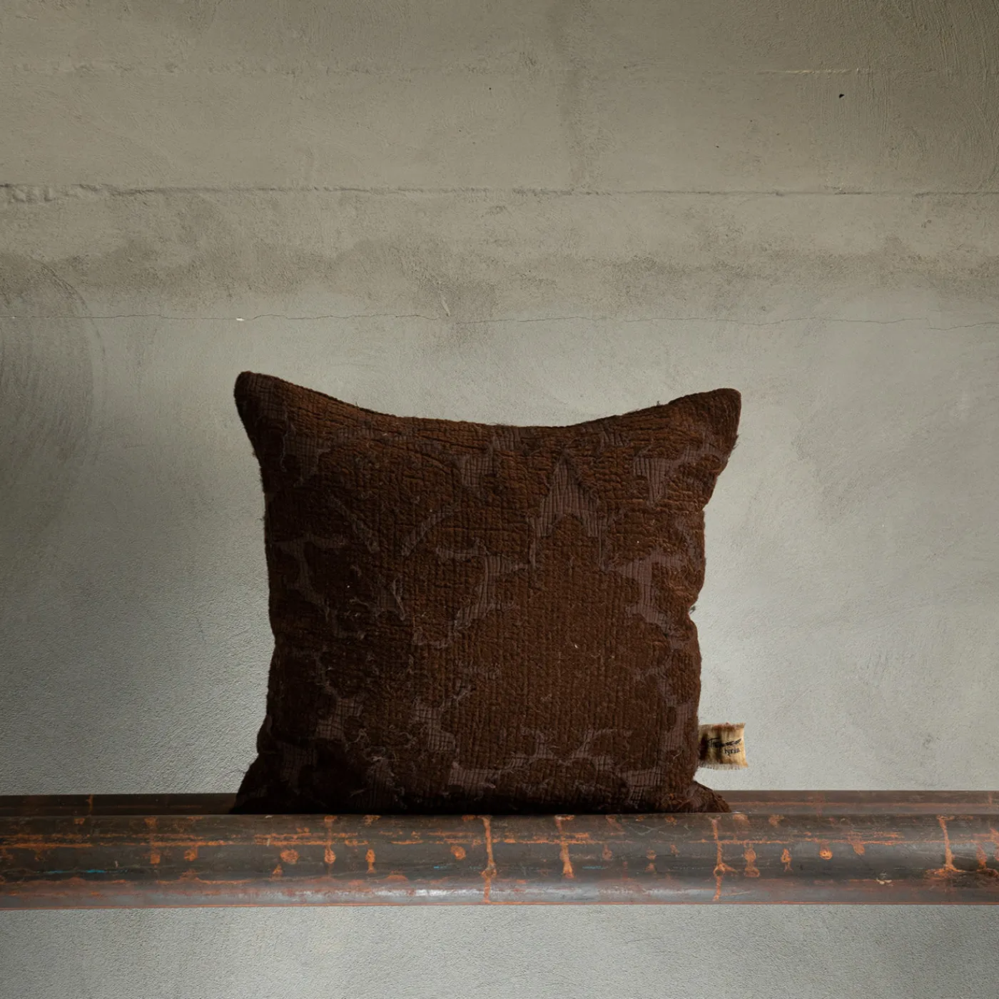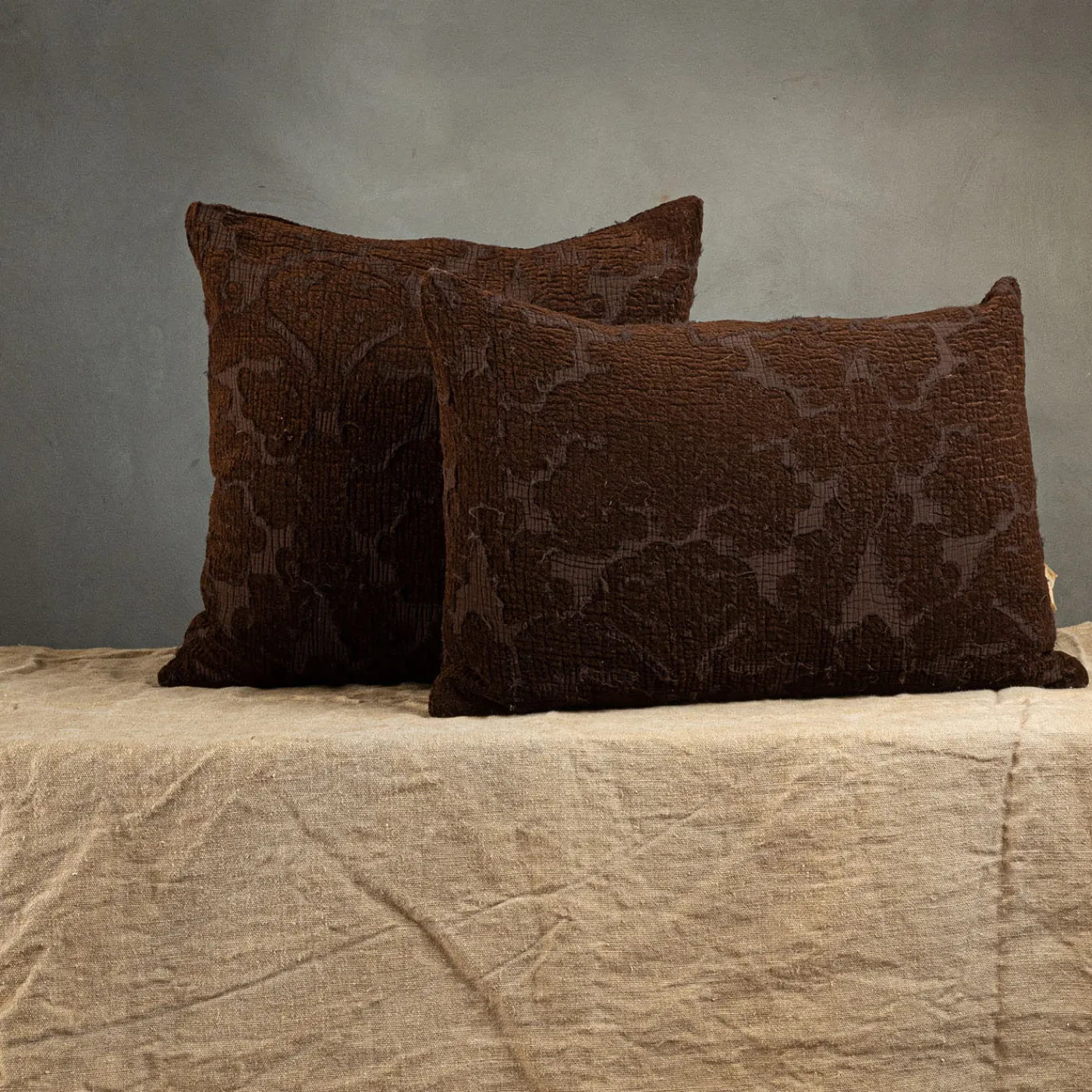 Questo cuscino quadrato, con la sua ricca tonalità di marrone scuro, è un complemento ideale per gli arredi in tonalità della terra e, allo stesso tempo, è audace e romantico. La trama in seta jacquard della fodera sfoggia un delicato disegno floreale, conferendo al cuscino un aspetto e una sensazione intriganti che ne dichiarano inequivocabilmente la qualità artigianale.