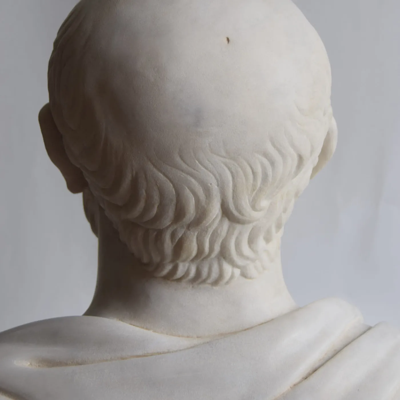 Minuziosamente scolpito in marmo bianco di Carrara, questo busto antropomorfo riproduce fedelmente le fattezze del celebre medico e geografo greco Ippocrate. Considerato il padre della medicina, gli si attribuisce il merito di aver coniato il Giuramento di Ippocrate, un giuramento etico storicamente fatto da medici e dottori.