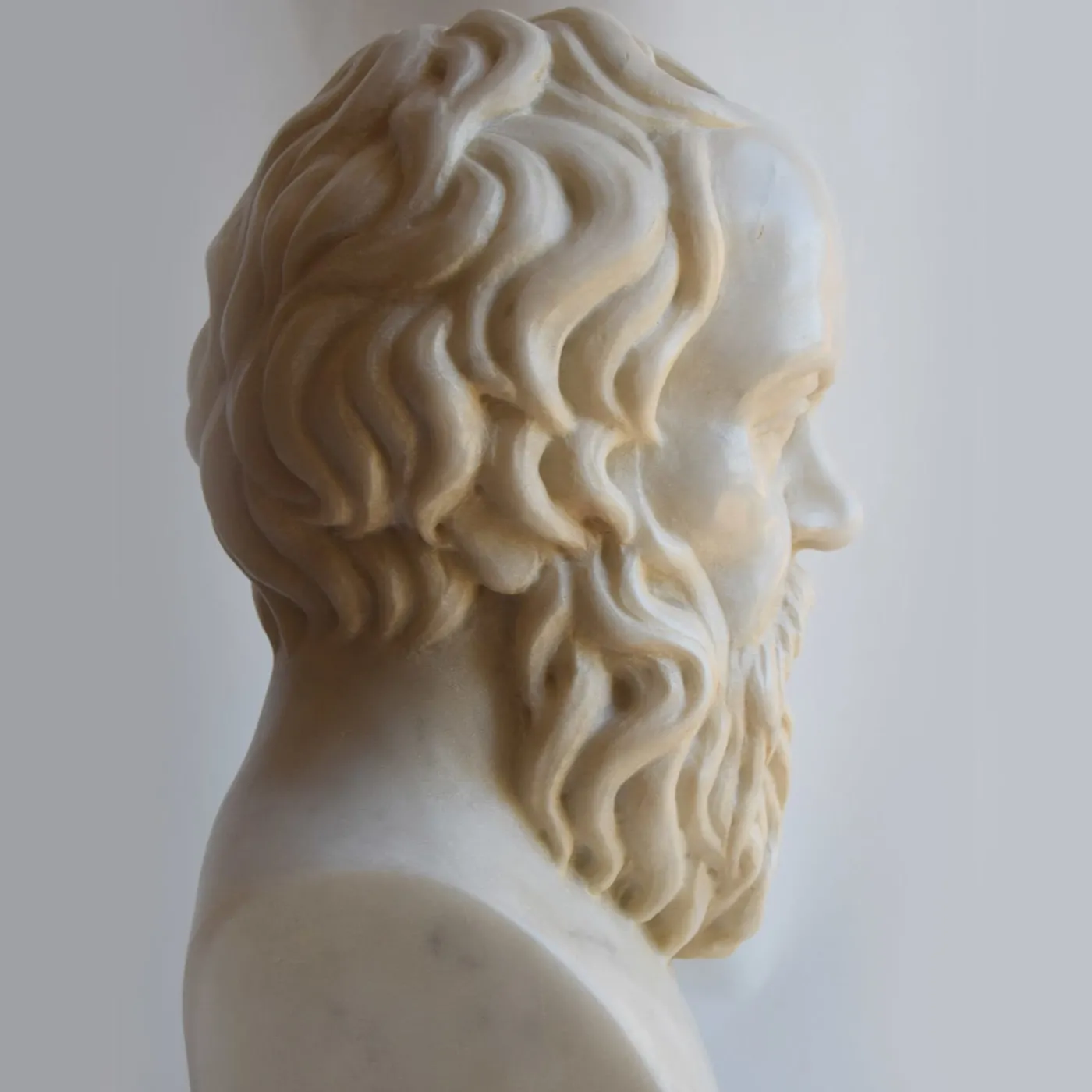 Busto del famoso filosofo greco antico Socrate, scolpito in marmo bianco di Carrara, posto su una base tornita in prezioso marmo brecciato mediceo.