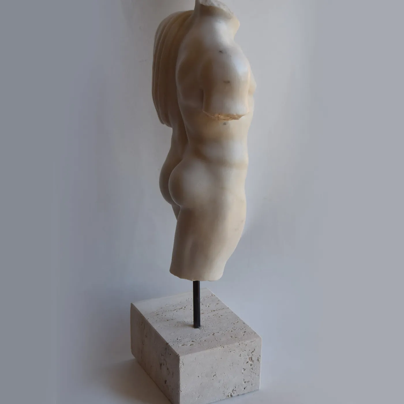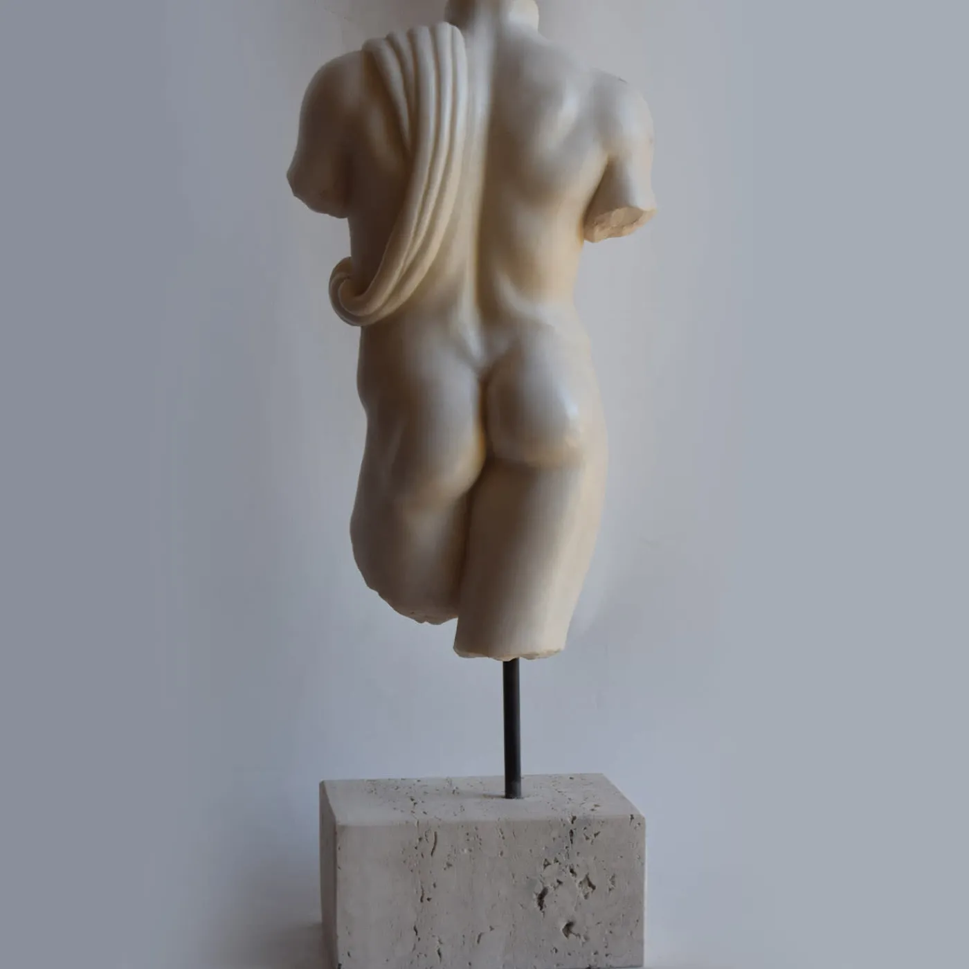 Torso maschile in marmo con panneggio posto su una base di travertino romano. Scolpito su marmo bianco di Carrara.