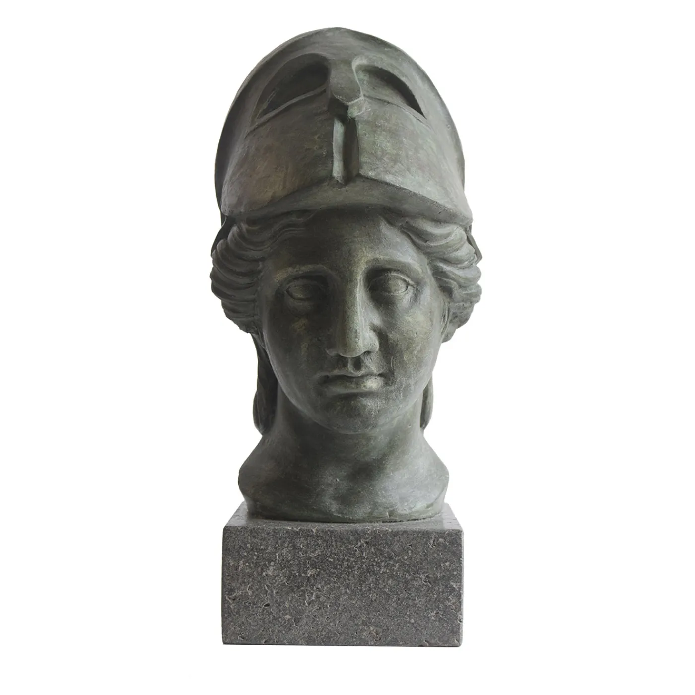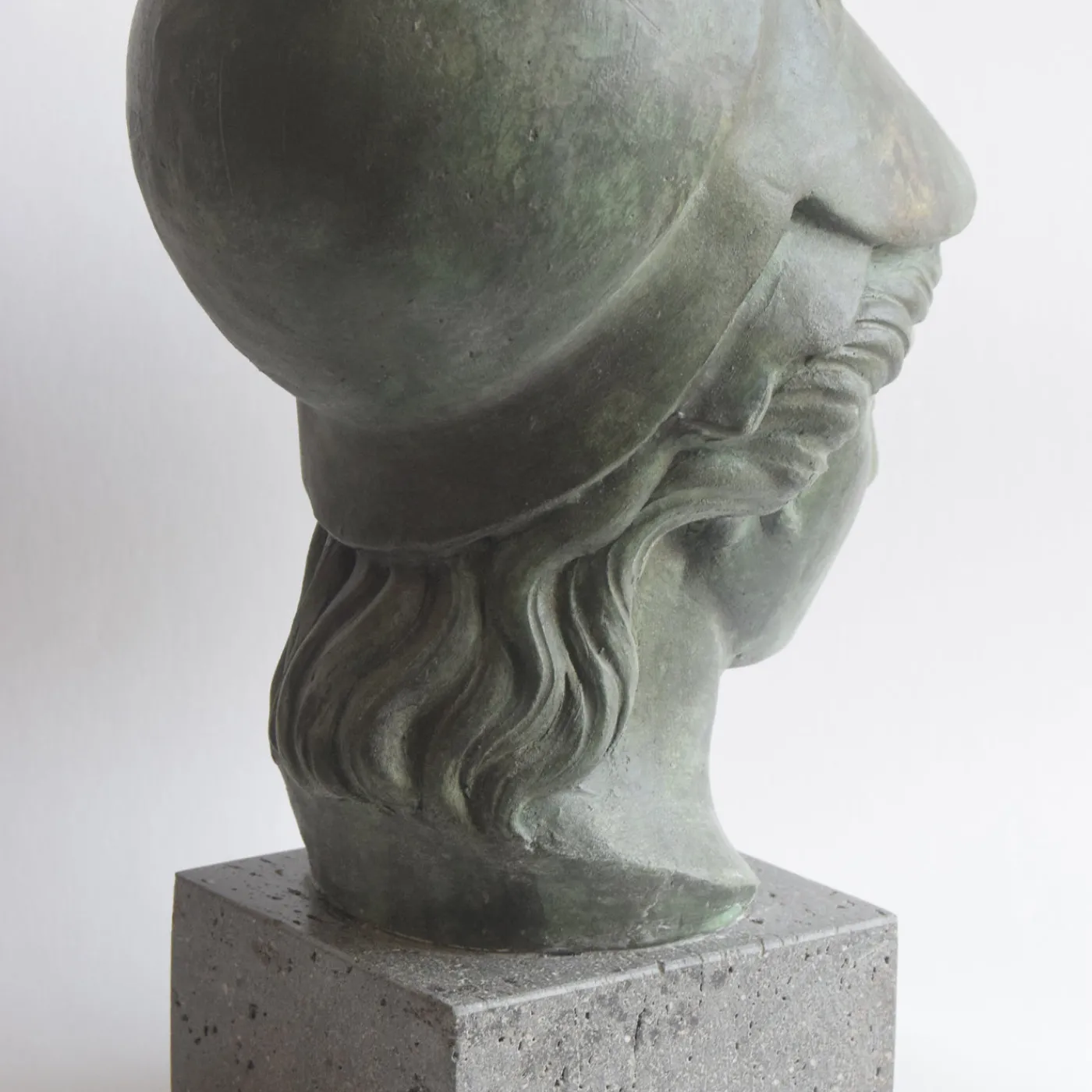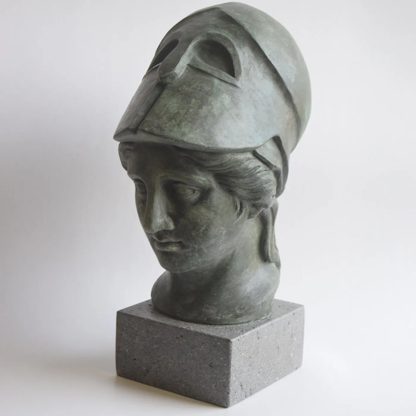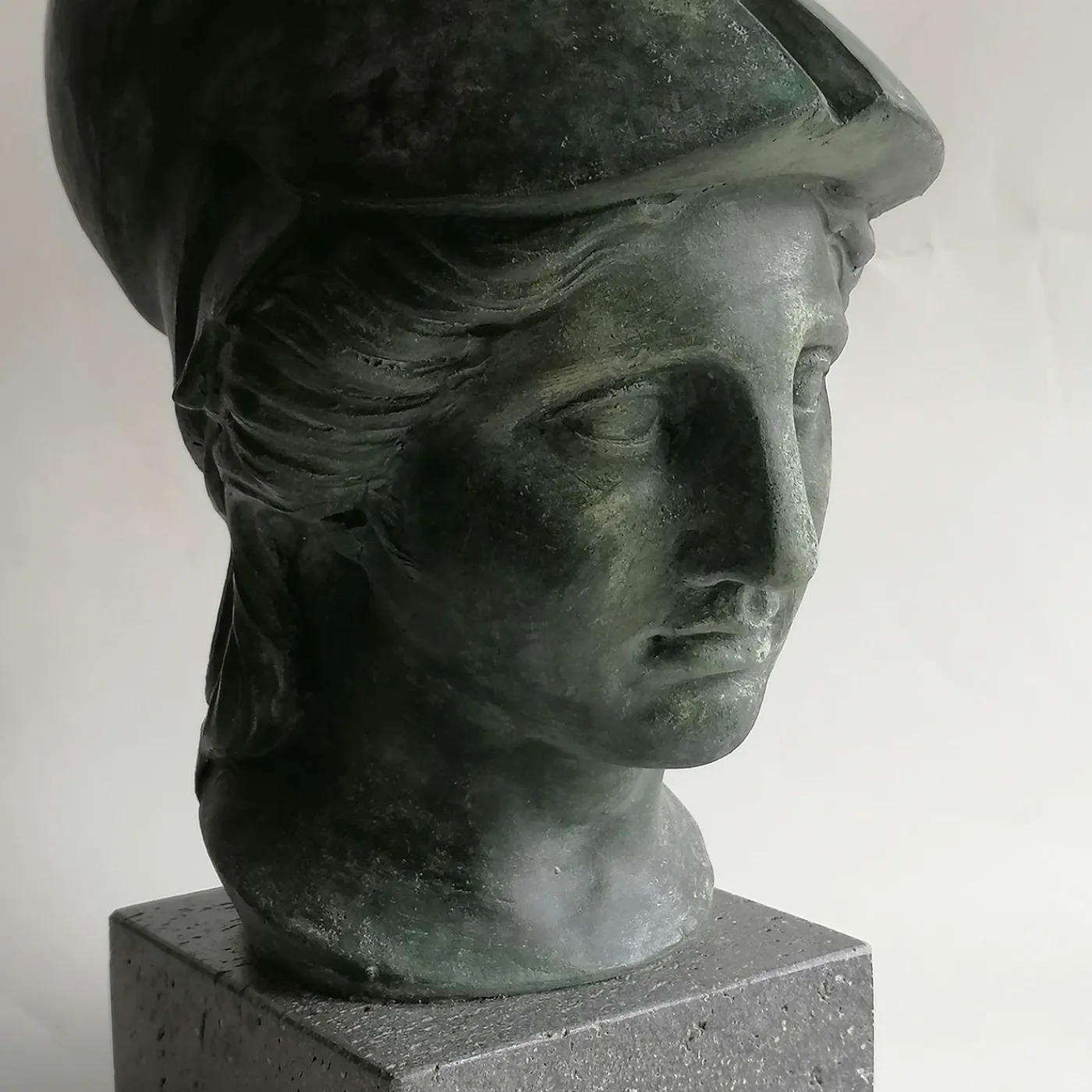 Scultura in ceramica bronze patinato della testa di Atena montata su una base in pietra vulcanica. progettata come oggetto decorativo di medie dimensioni, cattura l’eleganza classica e la forza senza tempo. certificata per la qualità dalla regione Lazio, questo pezzo integra arte storica con il décor contemporaneo per la casa. ideale per aggiungere un tocco sofisticato agli spazi abitativi o agli uffici. Pezzo unico.