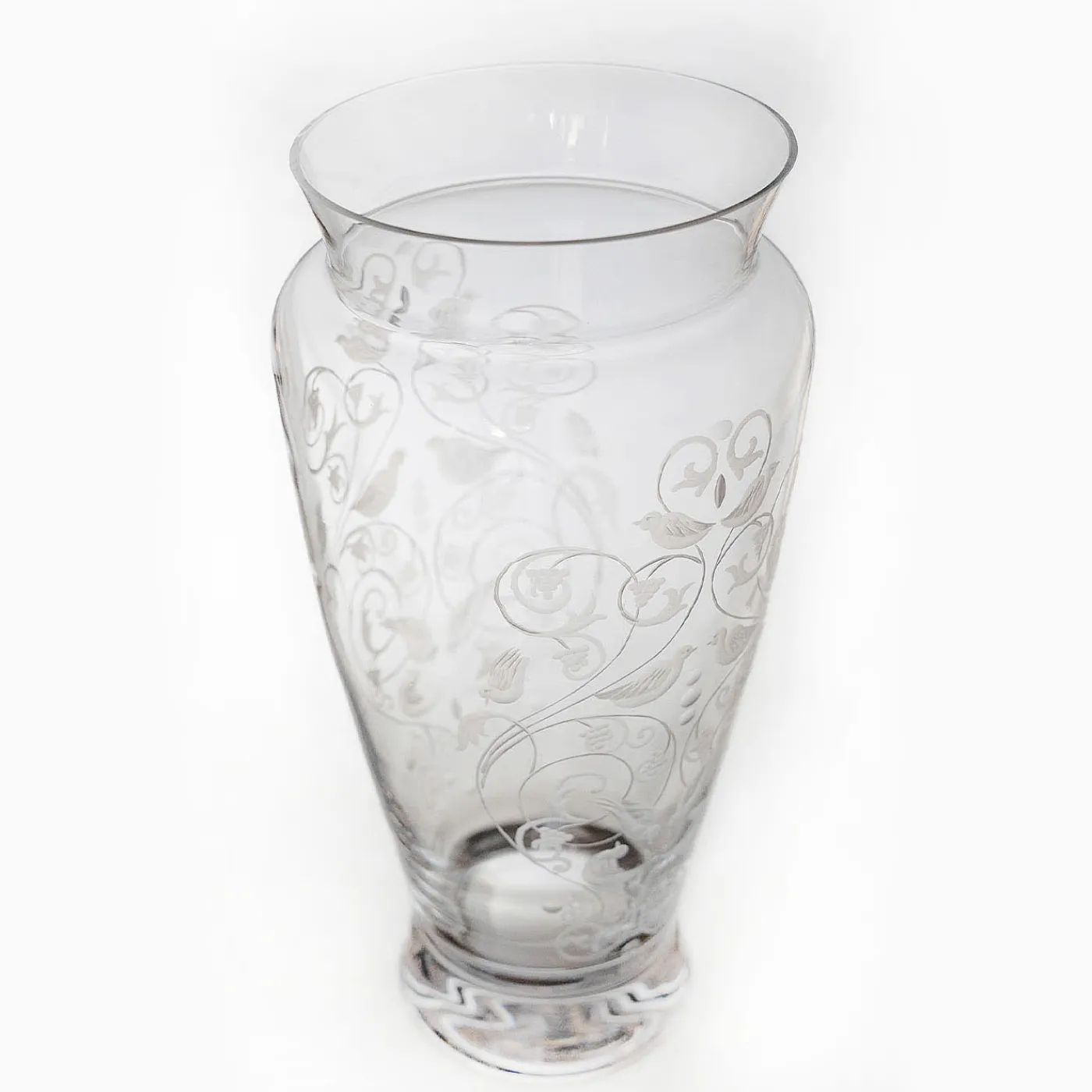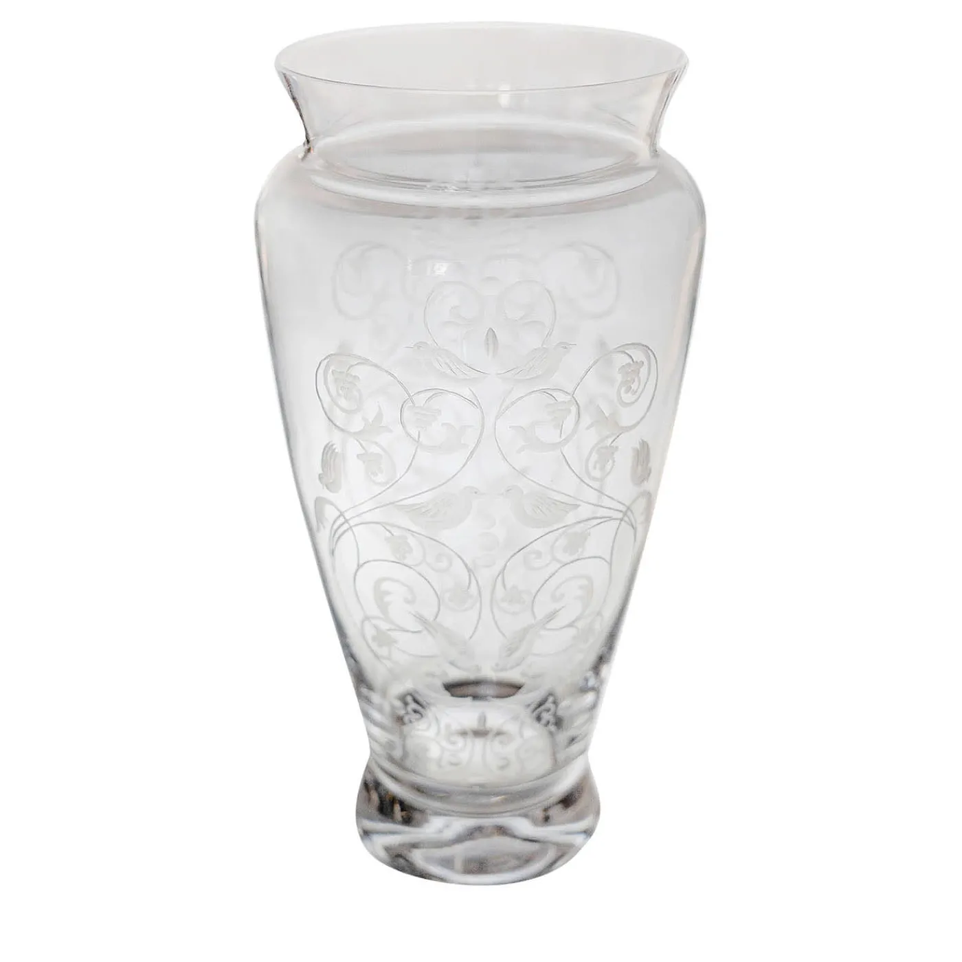 Vaso in vetro soffiato trasparente e inciso a mano da una ruota di pietra con un motivo di ramages con piccoli rampicanti, uccelli, foglie e volute che riempiono la superficie del vaso. Adatto per l’uso ma anche per abbellire uno spazio.