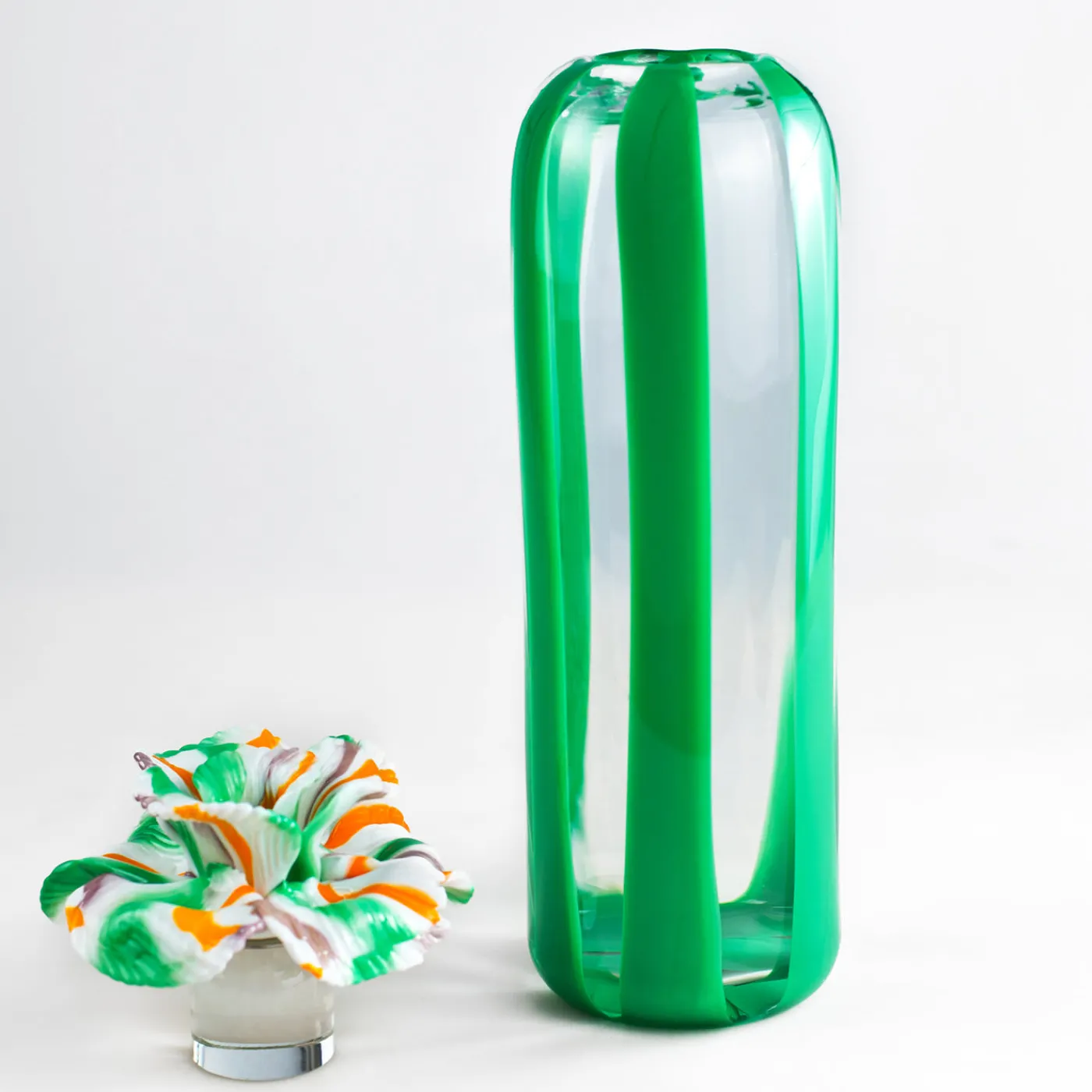 Dalla collezione Rigadoni, questa scultura è caratterizzata da strisce verticali verde brillante su vetro trasparente. A chiudere il vaso è un fiore di Torcelo, realizzato a strisce bianche, corallo, verdi e malva. Strettamente decorativo, il pezzo fonde perfettamente la tradizione con il gusto contemporaneo, rendendolo facile da esporre in qualsiasi contesto di design.