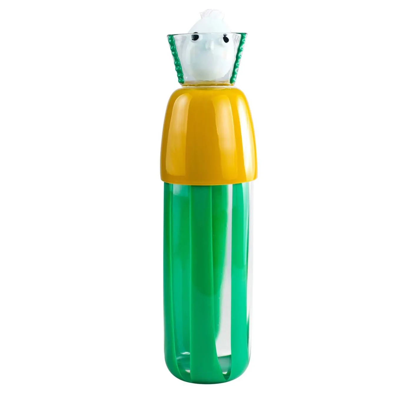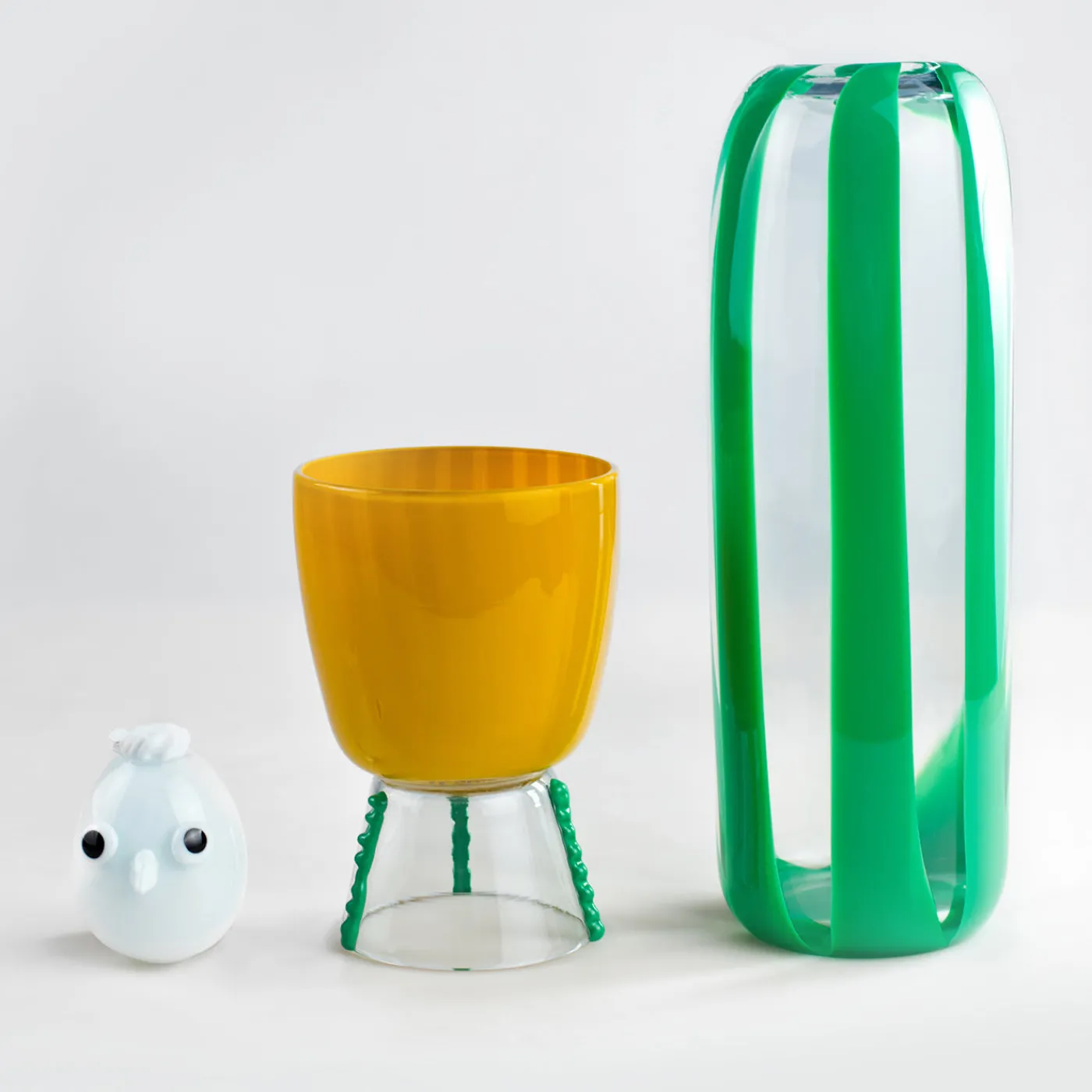 Un personaggio unico in tre pezzi per un effetto misterioso. Con un busto giallo senape, il pezzo poggia su una vivace base in vetro trasparente con strisce verdi. Il pezzo è sormontato da un collare in vetro trasparente, che protegge una testa in vetro bianco dall’espressione affascinante. Un divertente pezzo decorativo che attirerà sicuramente l’attenzione.
