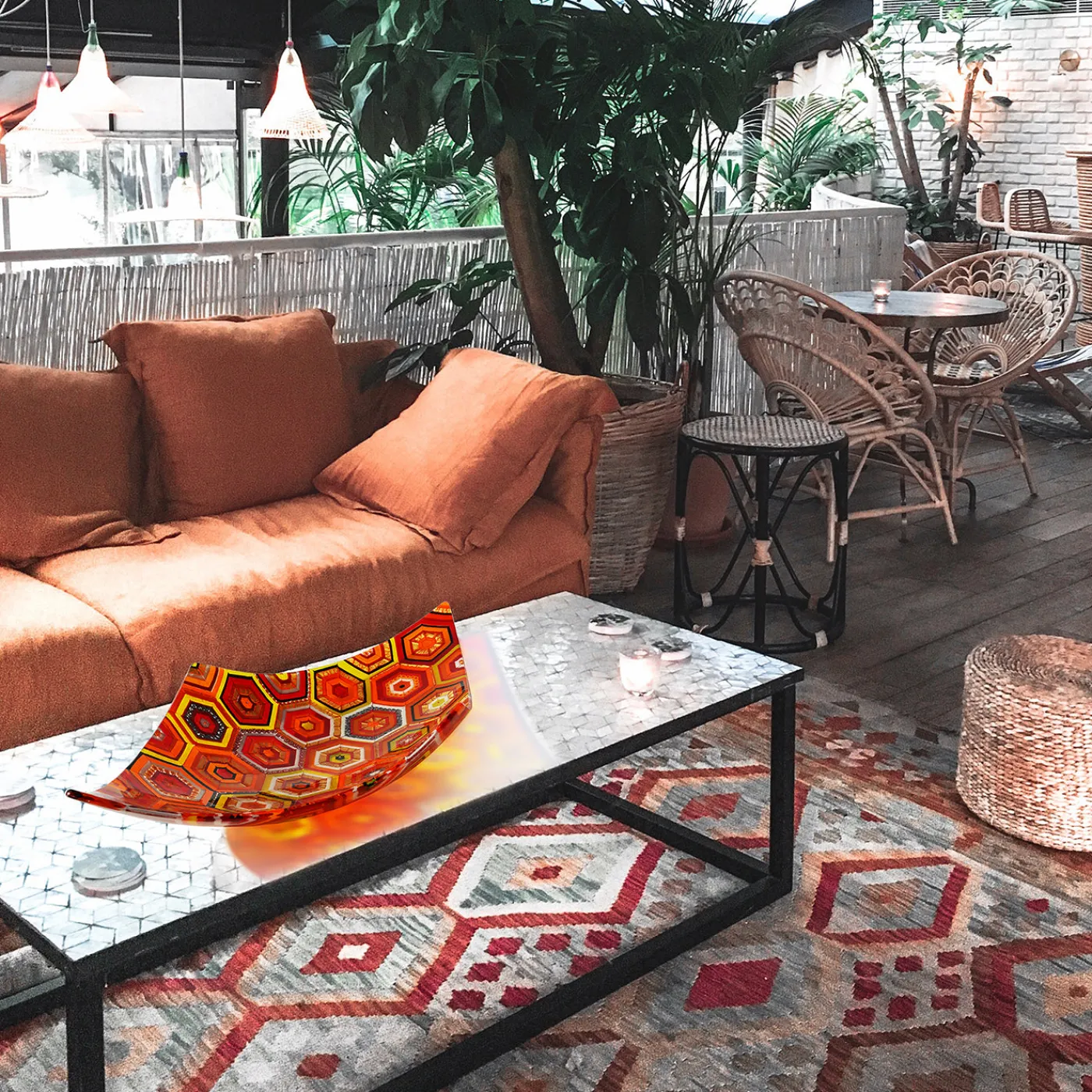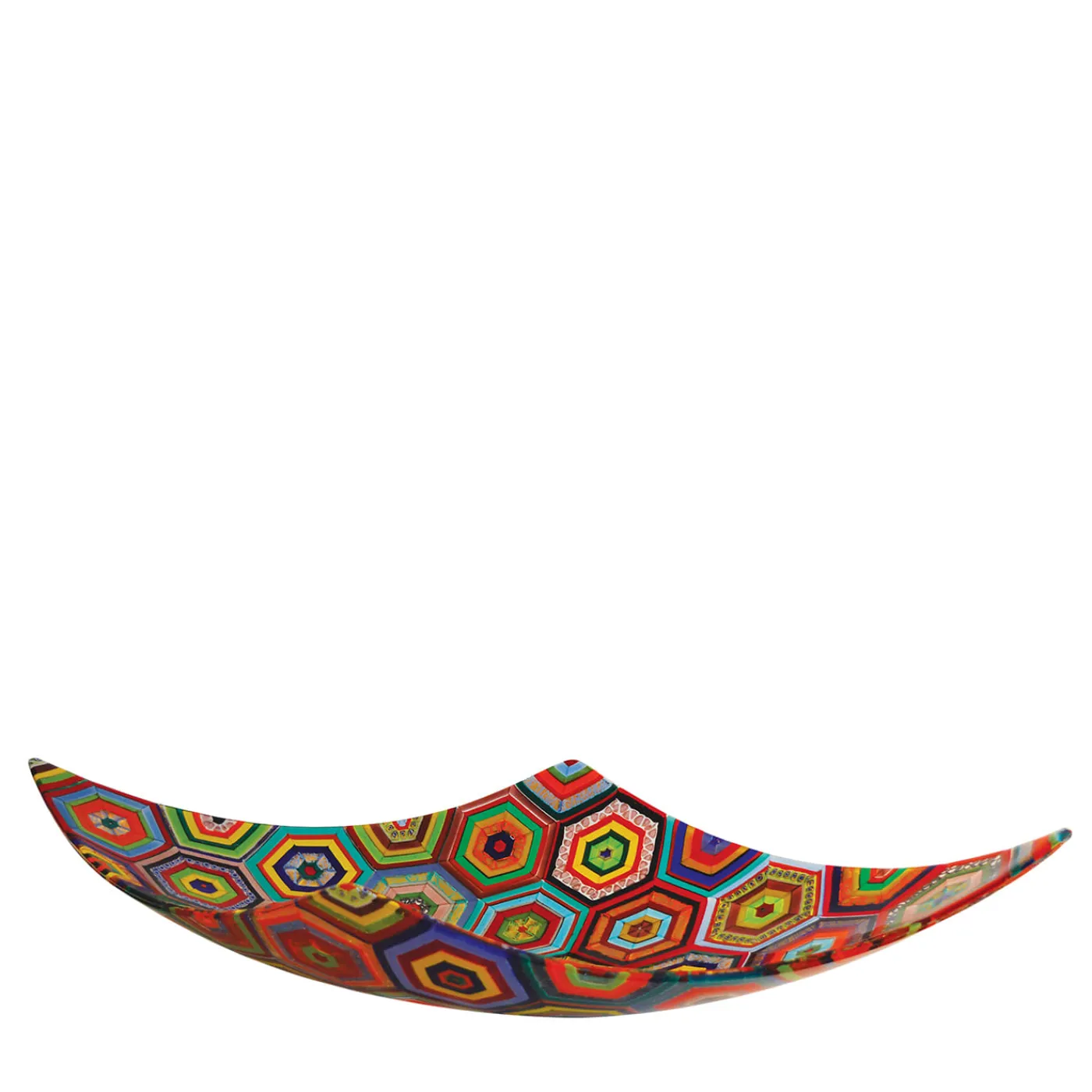 Il lusso senza tempo che permea tutti i capolavori in vetro di Murano non fa eccezione in questa superba coppa da centrotavola. A forma di rombo, l’ipnotizzante motivo di esagoni policromi – evocativo di splendide maioliche dipinte a mano – è arricchito da accenti in foglia d’oro e murrina per un maggiore appeal visivo. Le dimensioni generose ne fanno un complemento d’arredo di grande effetto, adatto a contesti di ospitalità o contract raffinati.