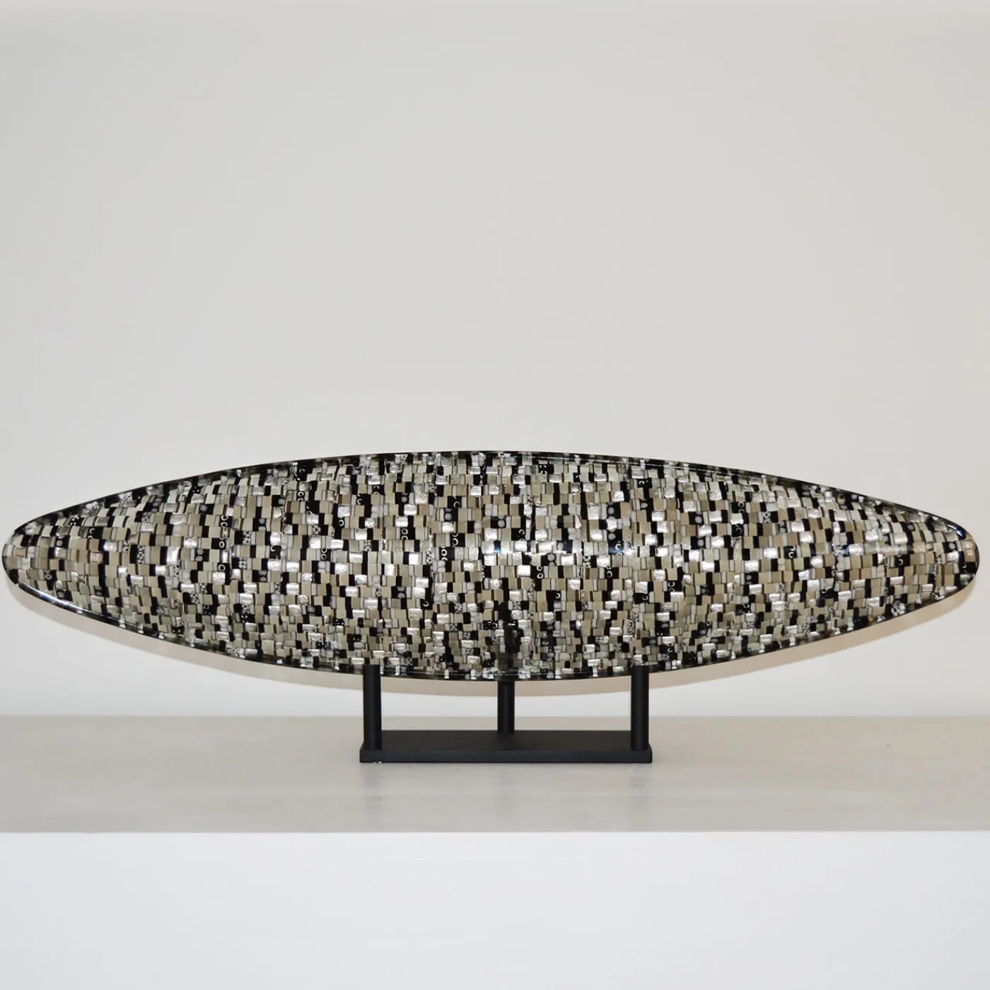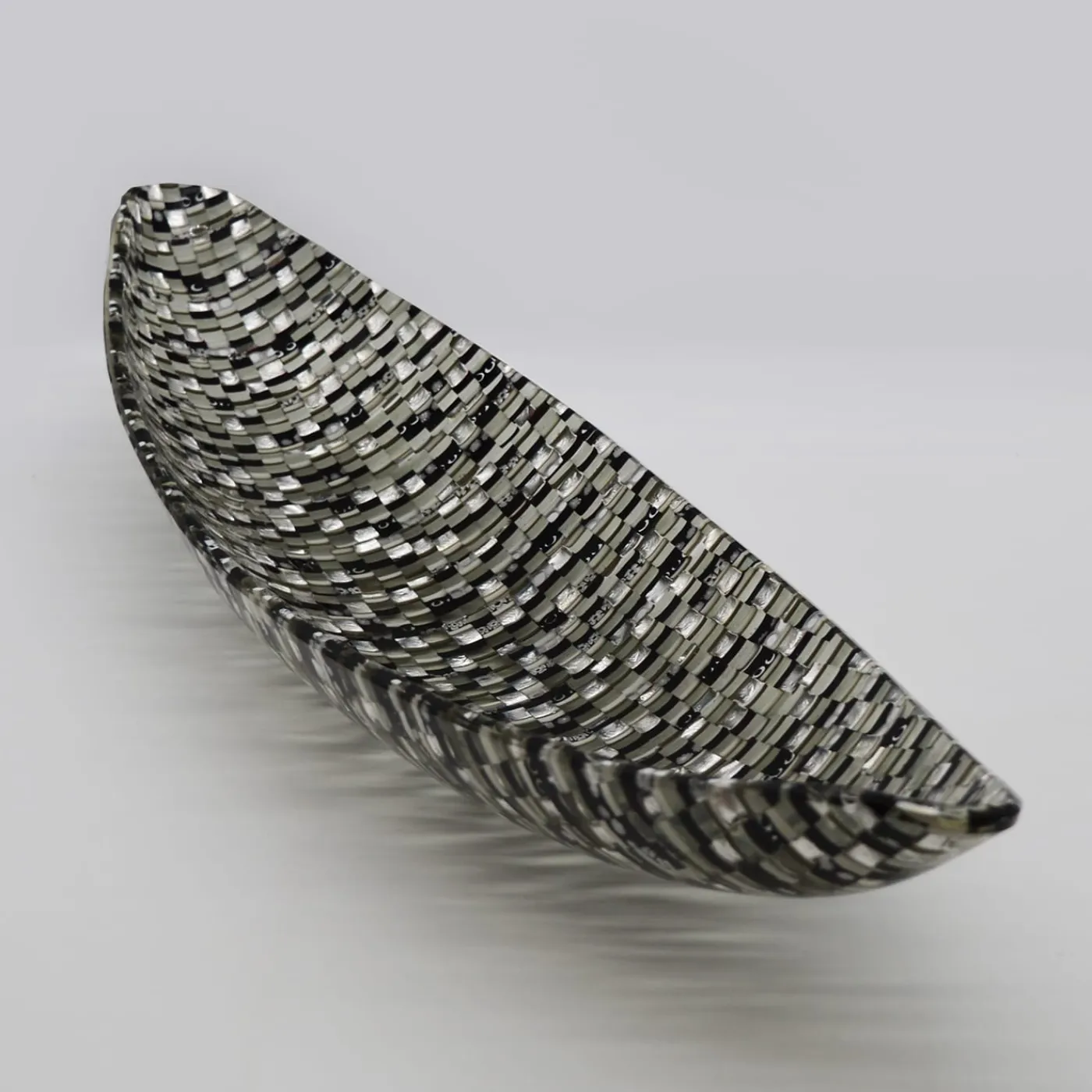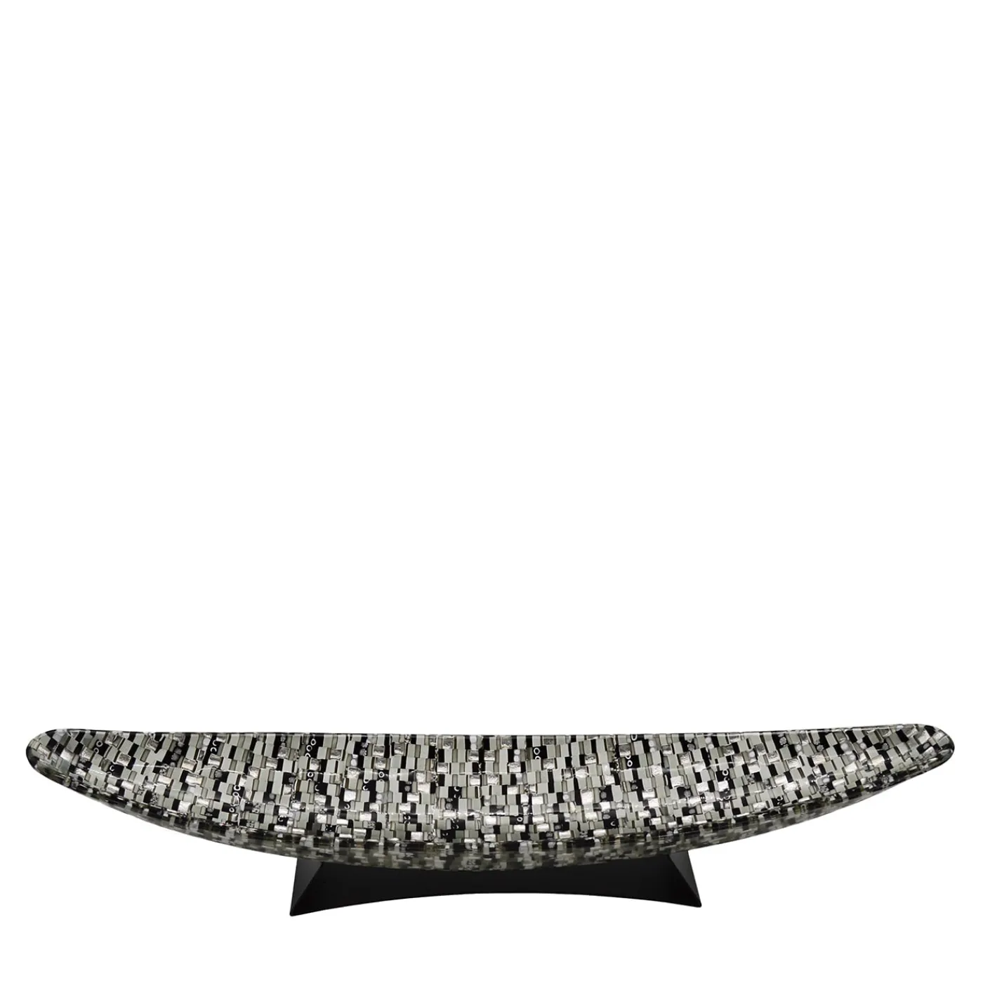 A forma di “gondola” – l’iconico mezzo di trasporto per esplorare i canali veneziani – questo centrotavola è un gioiello dell’arte vetraria. Un trionfo di tessere di vetro di Murano grigio, bianco e nero, minuziosamente assemblate a mano prima di essere arricchite con preziosi granelli di foglia d’oro e d’argento. Le sue dimensioni maestose la rendono un complemento ideale per raffinati contesti contract, privati o di ospitalità.