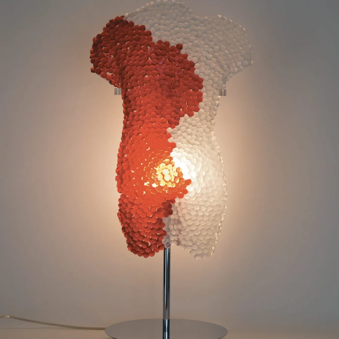 “Body” è una scultura in vetro di Murano di grandi dimensioni. Il corpo dell’oggetto è formato da pezzi di vetro rosso trasparente e da una canna di cristallo. La scultura si adatta a molte soluzioni stilistiche in qualsiasi spazio. È dotata di un supporto in metallo cromato, di elementi in plexiglas appositamente progettati per sostenere saldamente la scultura e di un sistema di retroilluminazione a 2 luci.