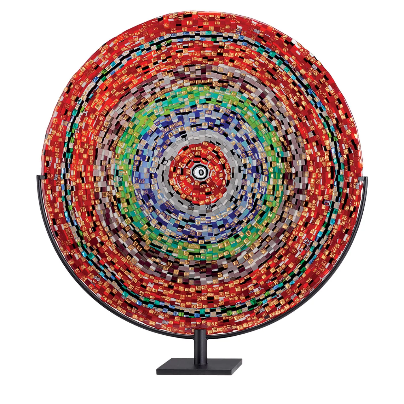 Ricca di fascino contemplativo senza perdere il suo estro, questa scultura catalizzerà l’attenzione in ogni tipo di spazio pubblico o domestico. Un’essenziale base metallica verniciata in grigio antracite sostiene l’imponente disco, ottenuto dal minuzioso assemblaggio manuale di tessere di vetro di Murano secondo una successione concentrica di tonalità brillanti e riccamente contrastanti.