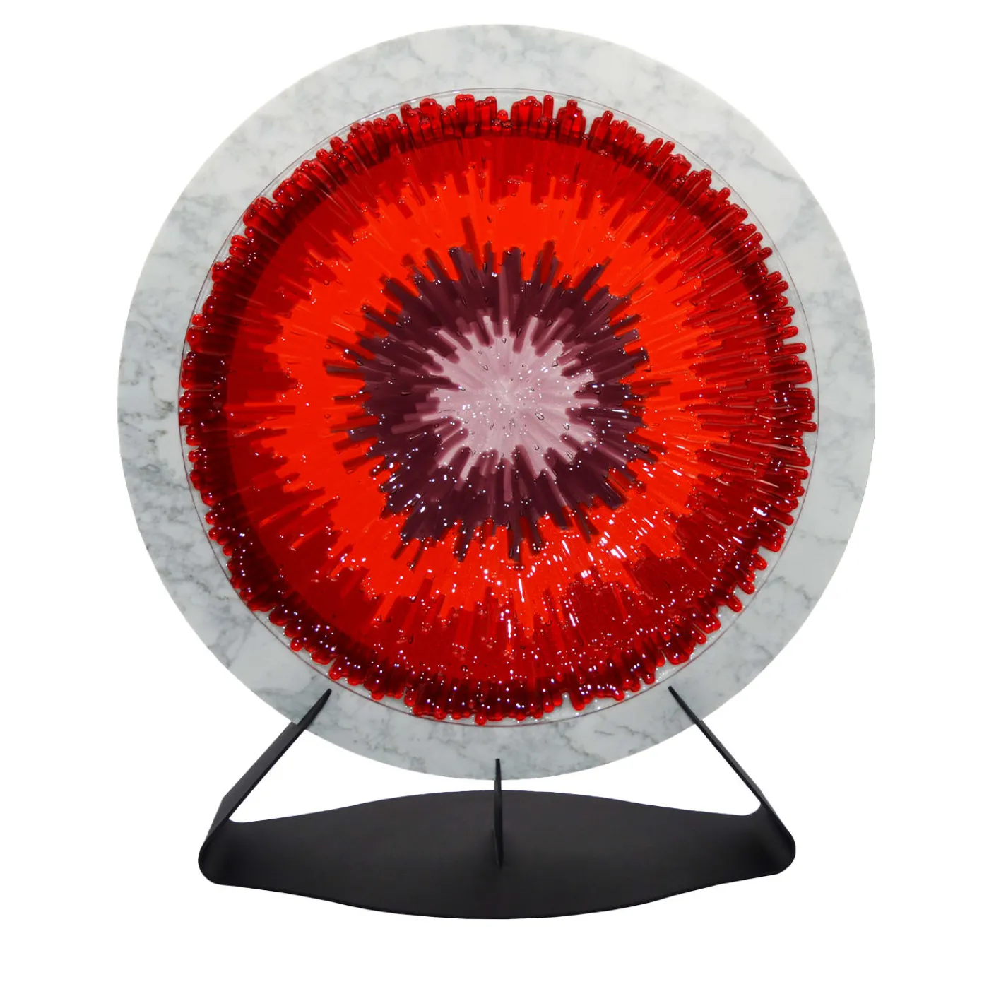 Ogni angolo, mensola e consolle può diventare unico con l’esposizione di una scultura in vetro di Murano come “Target”, composta da una raffinata sequenza di colori eseguita con bacchette di vetro trasparente all’interno di un cerchio di marmo di Carrara. La scultura è sostenuta da un importante supporto in metallo verniciato grigio antracite.