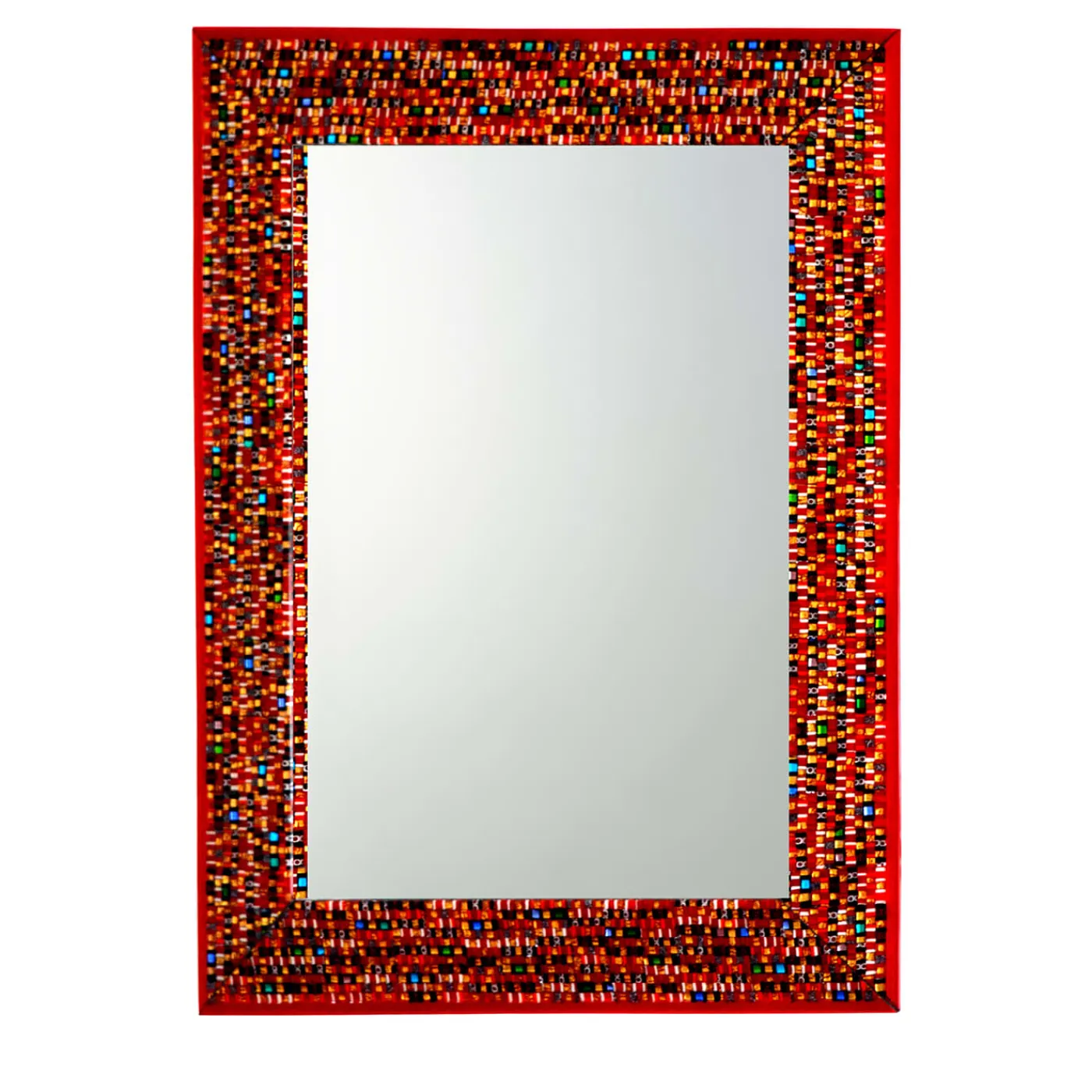 “Phoenix” è uno specchio dal design importante con una cornice variegata prevalentemente rosso veneziano, realizzata a mano in vetro di Murano con decorazioni a mosaico di vari colori e inserti di foglia d’oro, foglia d’argento e particolari perle murrine veneziane. La struttura portante è realizzata con materiali naturali ed ecocompatibili adatti a sostenere il peso dello specchio e della cornice ed è predisposta in modo che lo specchio possa essere appeso sia in verticale che in orizzontale.