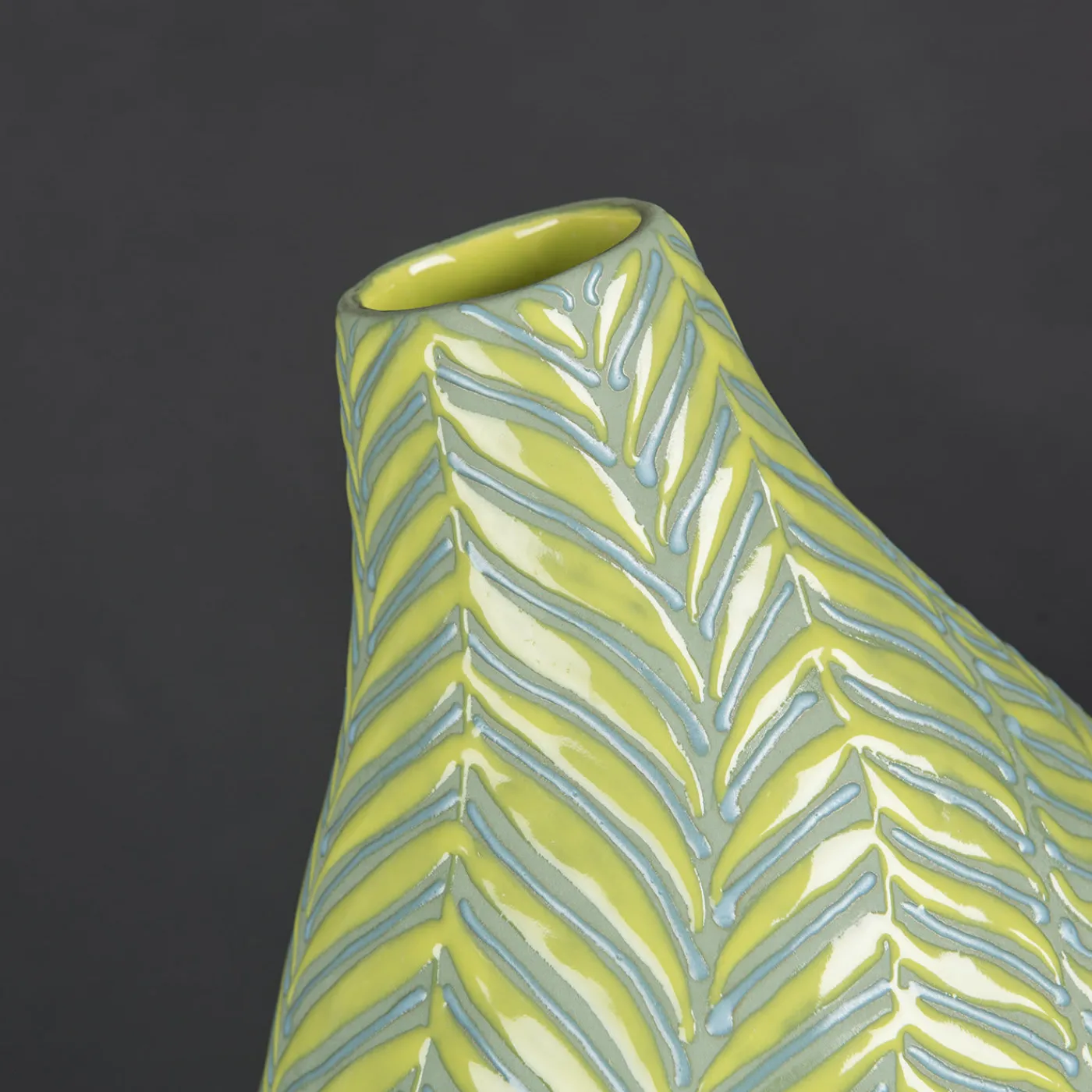 Superba vetrina di artigianato, questo vaso a forma di bottiglia celebra la natura e le sue delicate figure. Poggiato su una base in gres laccato oro, questo pezzo è realizzato a mano in ceramica ed è ornato da una splendida decorazione di fronde di felce.
