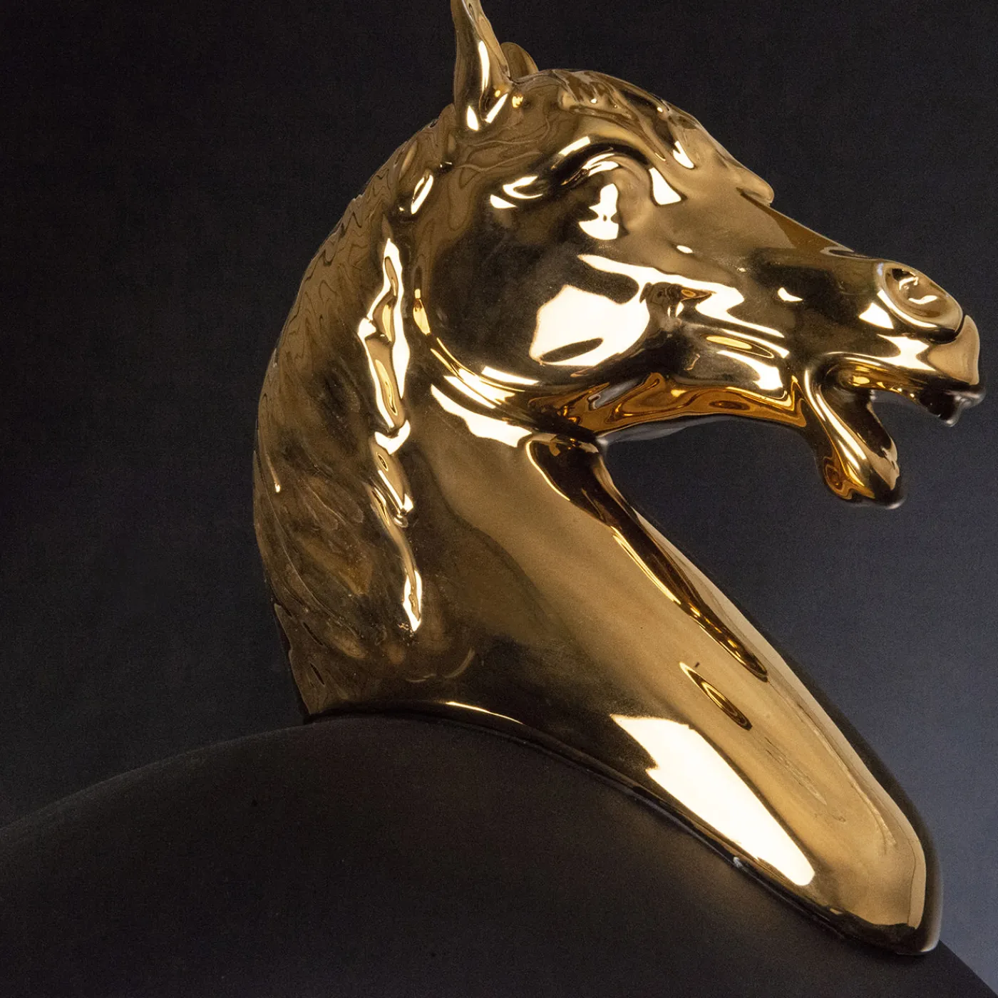 Questo squisito vaso in ceramica artigianale esprime il suo carattere eclettico grazie a una sapiente combinazione di elementi zoomorfi in stile barocco e di un corpo liscio e rigonfio in un’elegante finitura nera opaca. La sua allure opulenta, rivelata dalle maniglie a forma di cavallo color oro lucido, lo rende adatto a infondere un tocco eclettico a banchetti di lusso o a contesti privati.