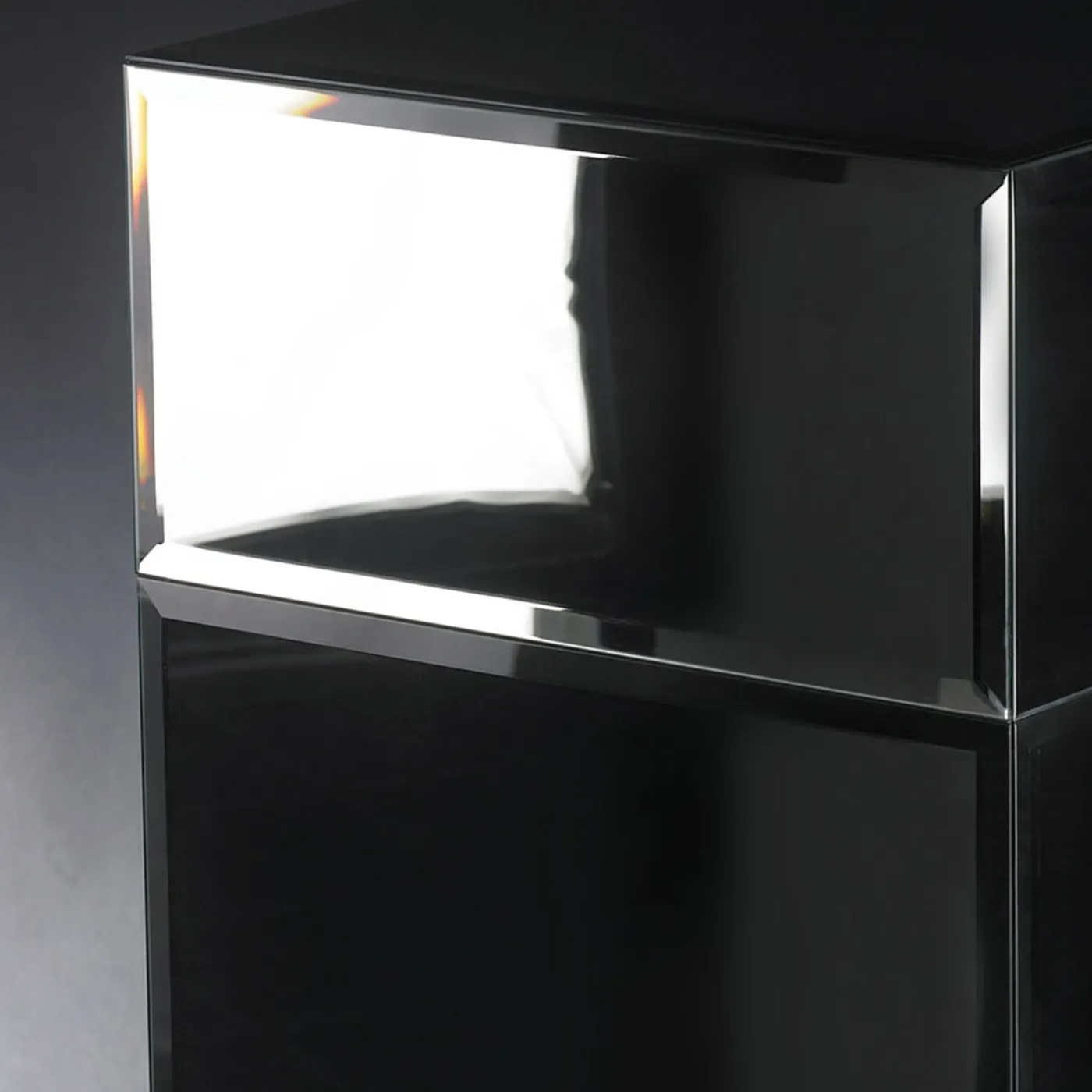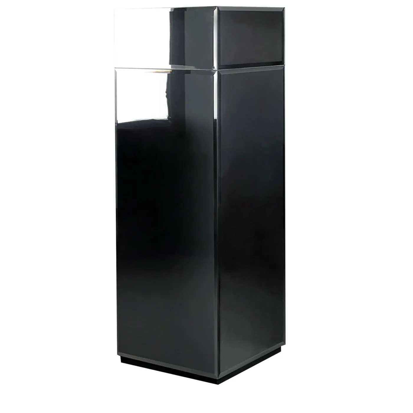 Pannelli di vetro a specchio rifiniti con bordi smussati compongono l’esterno di questa esclusiva colonna di sostegno, un design intelligente per mettere in mostra un vaso o una preziosa cornice fotografica. La silhouette sfaccettata, che si erge su una base con piedini neri, è sorprendente per la sua ampia qualità riflettente che aumenta la percezione visiva degli spazi. Si integra perfettamente con gli arredi contemporanei.