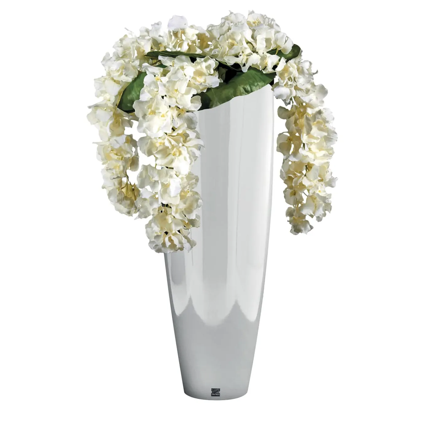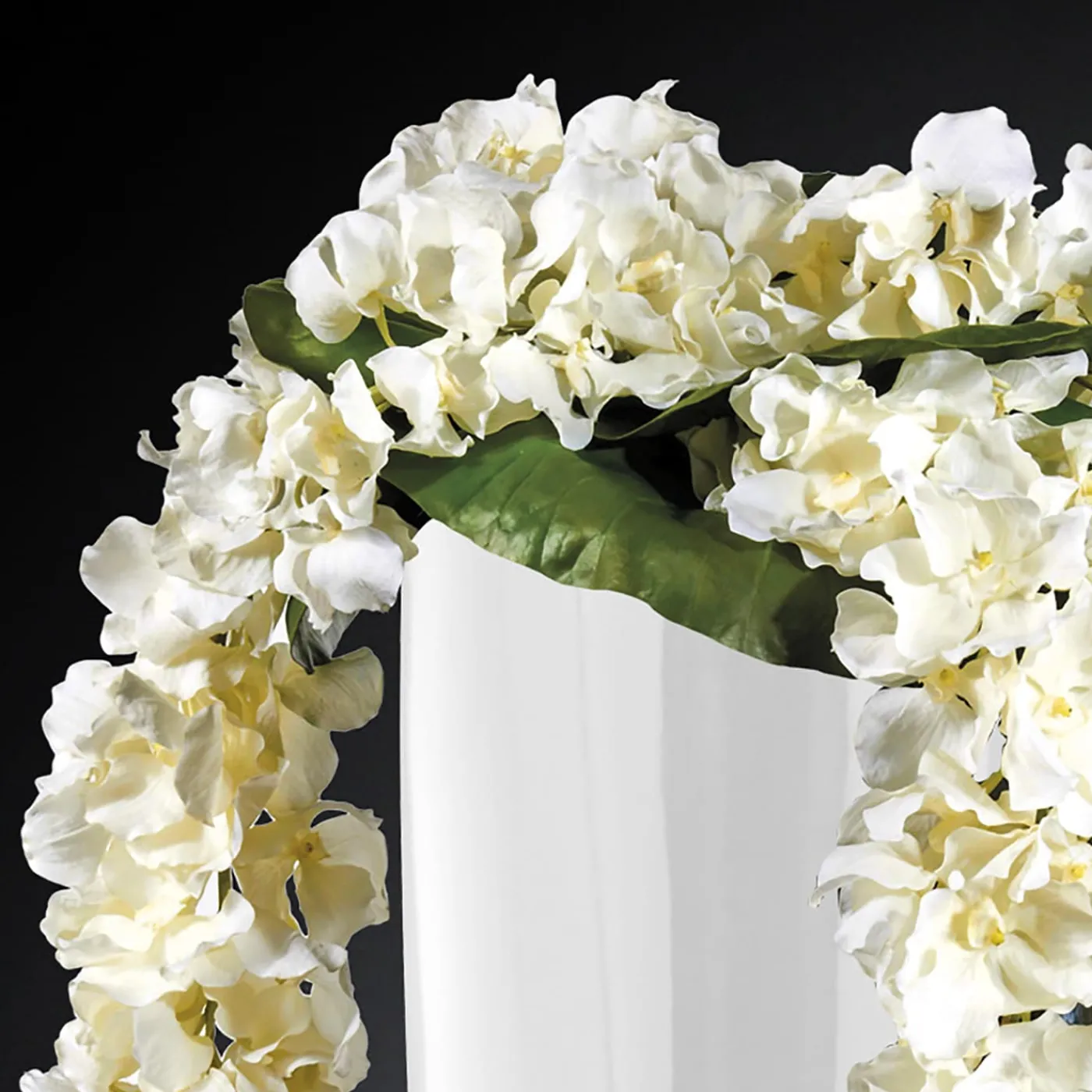 Altrettanto splendida nell’angolo di una casa o di un ristorante moderno e raffinato, questa romantica composizione è una creazione esclusiva dei floral designer di VGnewtrend. Una cascata di fiori bianchi si riversa dal vaso bianco allungato, i cui tratti distintivi sono la finitura lucida e la forma che si allarga progressivamente verso l’imboccatura, esaltando la sensazione di accoglienza.