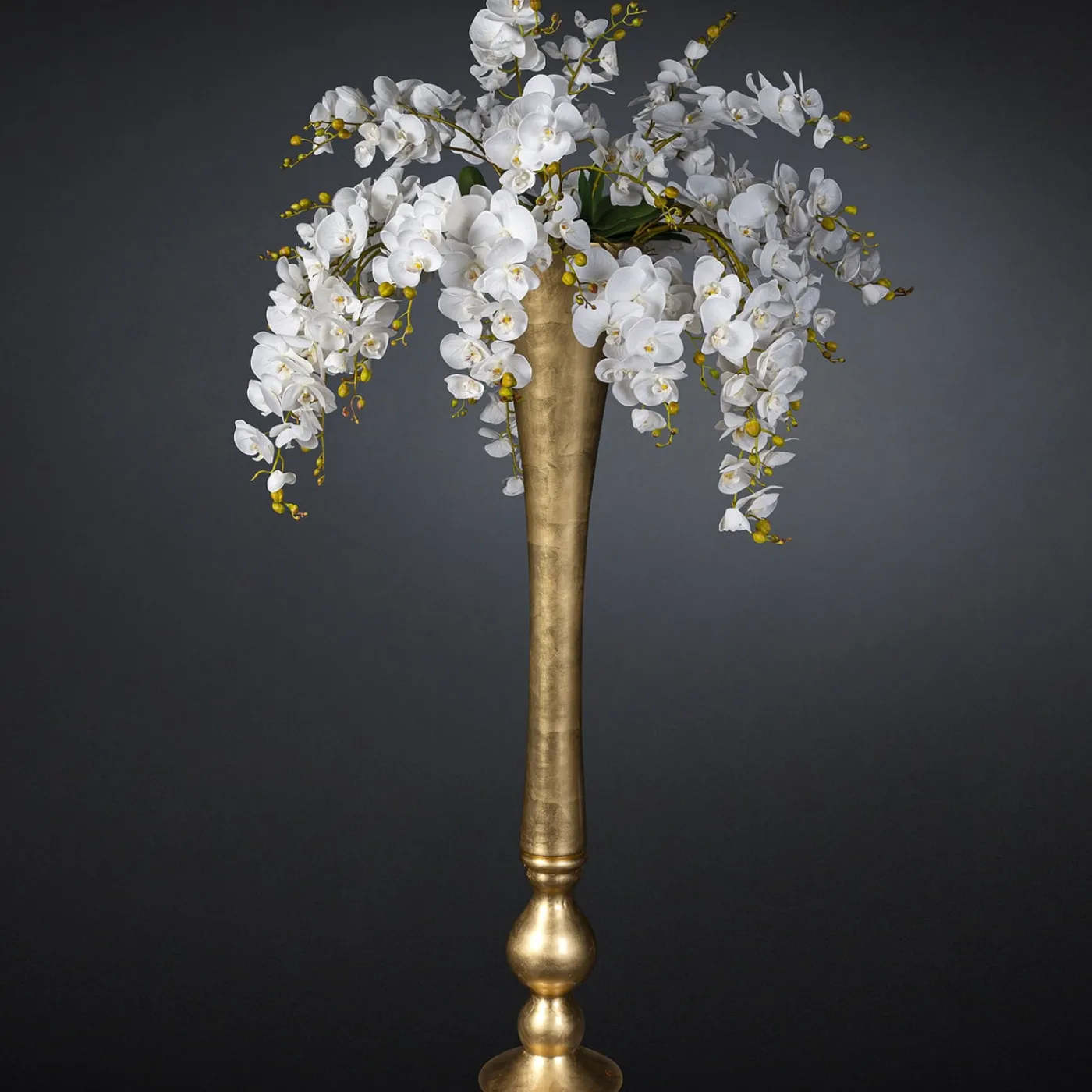 In questa splendida composizione, ideata dai designer floreali di VGnewtrend, graziosi rami di finte orchidee bianche fanno capolino da un vaso a tromba dalla forma drammaticamente slanciata. Ricoperto di foglia d’oro, come dichiarazione di glamour e opulenza senza pari, il vaso è una soluzione intelligente quando si vuole ottenere un centrotavola spettacolare senza sacrificare lo spazio sul tavolo.