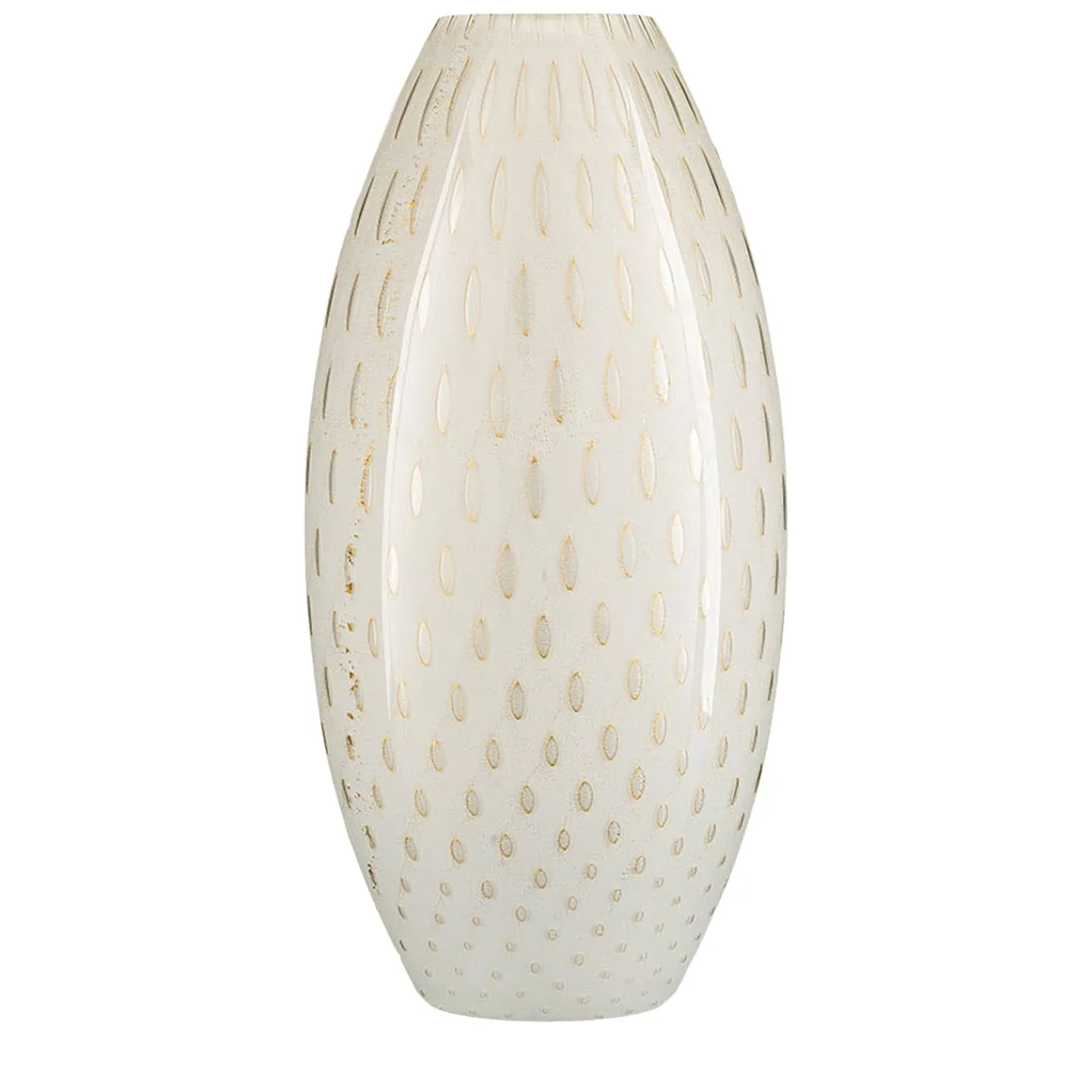 Opulenza ed eleganza sono splendidamente sintetizzate in questo vaso unico della serie Mocenigo. Caratterizzato da una forma pulita e rigonfia, si distingue per la purezza della sua tonalità lattiginosa e per il motivo a diamante di elementi dorati che gli conferiscono una sottile lucentezza. Soffiato a bocca da maestri artigiani in pregiato vetro di Murano, è disponibile in più versioni di colore da esplorare nel catalogo Artemest.