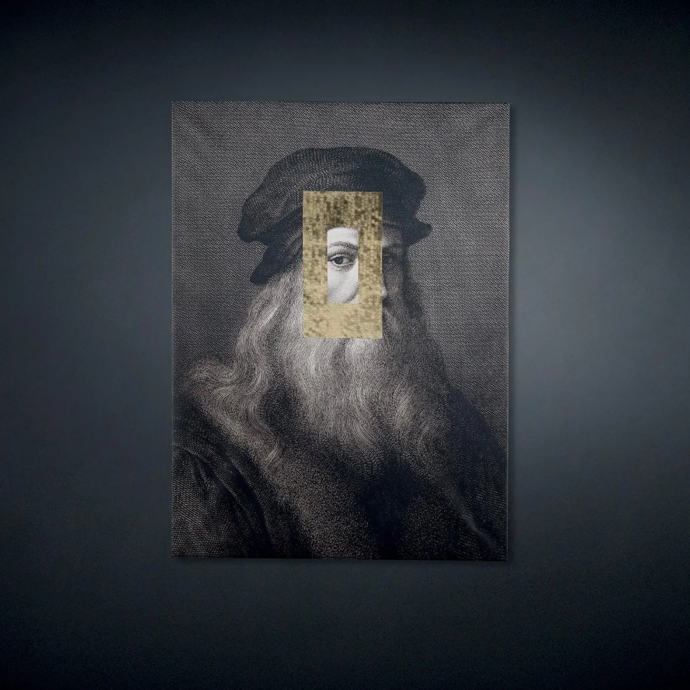 L’autoritratto di Leonardo Da Vinci, con un intrigante tocco contemporaneo, definisce questo sorprendente pannello decorativo. Stampato su tela e montato su un robusto telaio in legno, il pezzo è un’aggiunta intelligente agli spazi moderni che si desidera arricchire con un po’ di genio e un pizzico di ispirazione artistica. La decorazione rettangolare è in preziosa foglia d’oro.