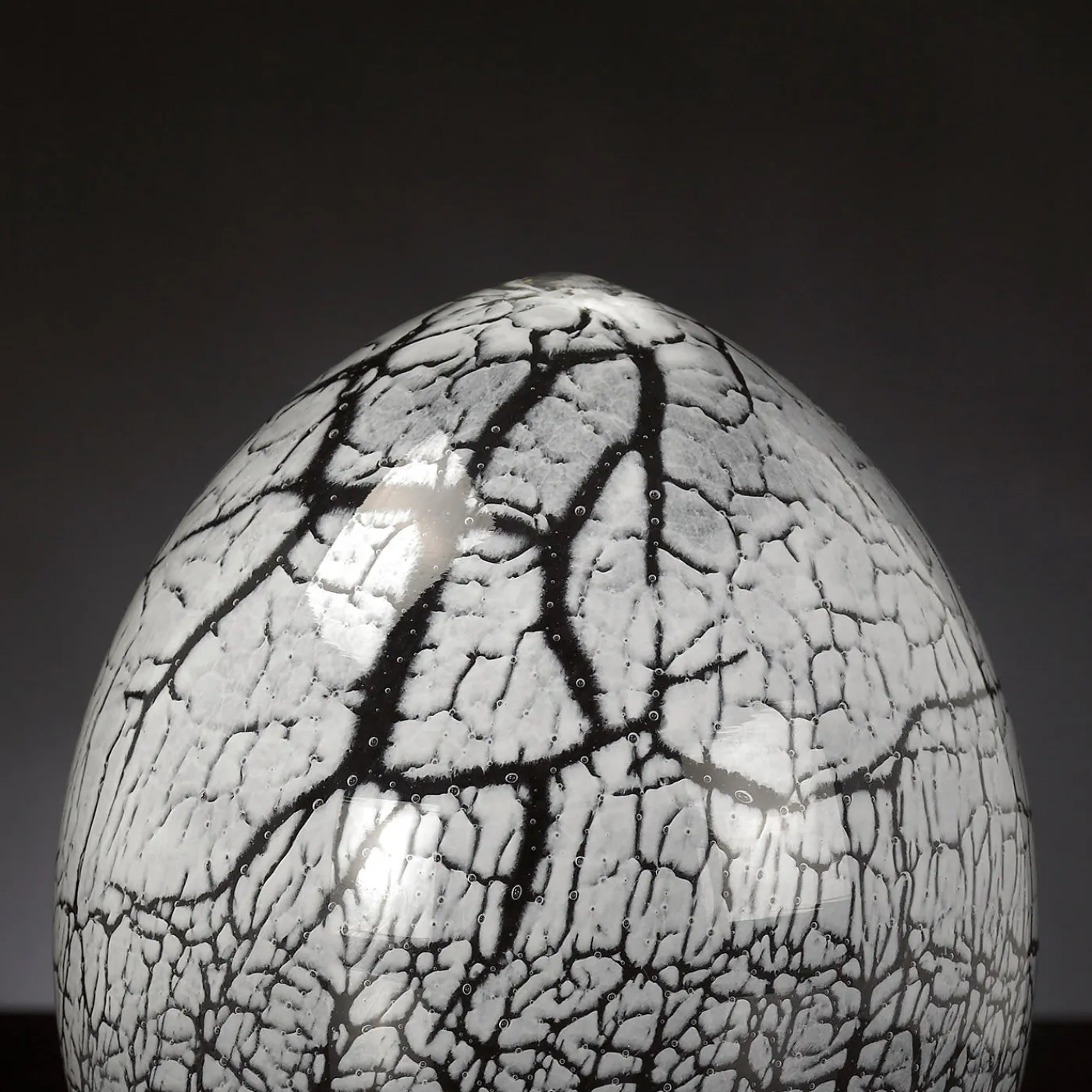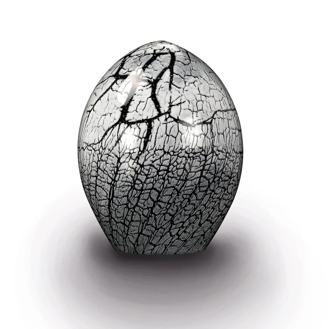Questa suggestiva statuetta in vetro rappresenta il guscio di un uovo che si rompe, squisitamente reso con venature nere e grigie su una superficie bianca sfumata. Splendido pezzo di una raffinata serie di oggetti d’arredo, infonderà fascino e sottile raffinatezza a una casa moderna.