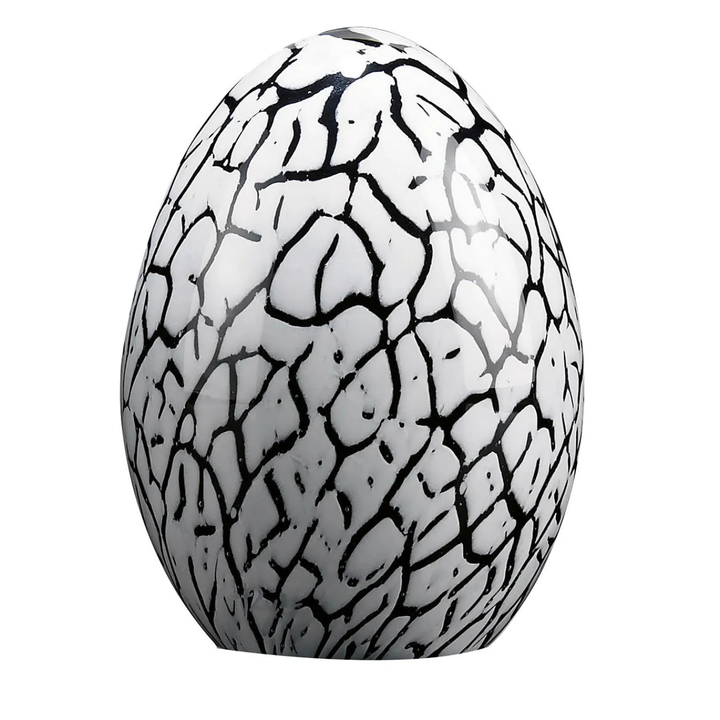 Questo piccolo oggetto d’arte farà la sua figura se esposto su una raffinata consolle, un tavolino o una credenza, o anche abbinato al pezzo nero della stessa serie per un accento di fascino contrastante. Realizzato a mano in vetro, sfoggia una silhouette bianco scuro impreziosita da venature nere che riproducono le fessure del guscio d’uovo.