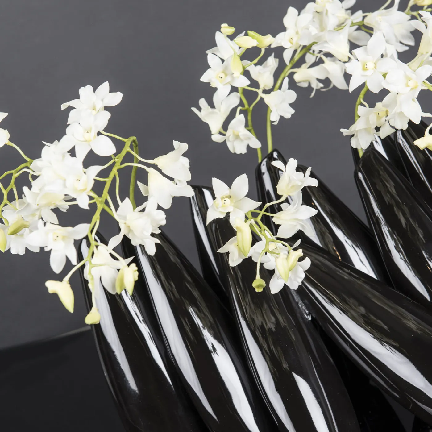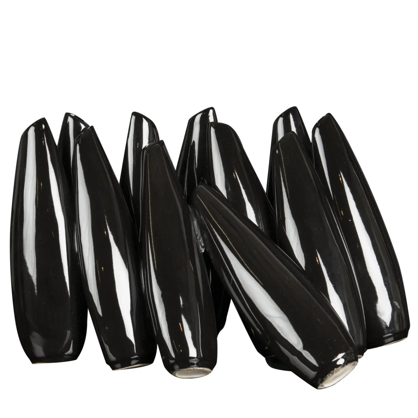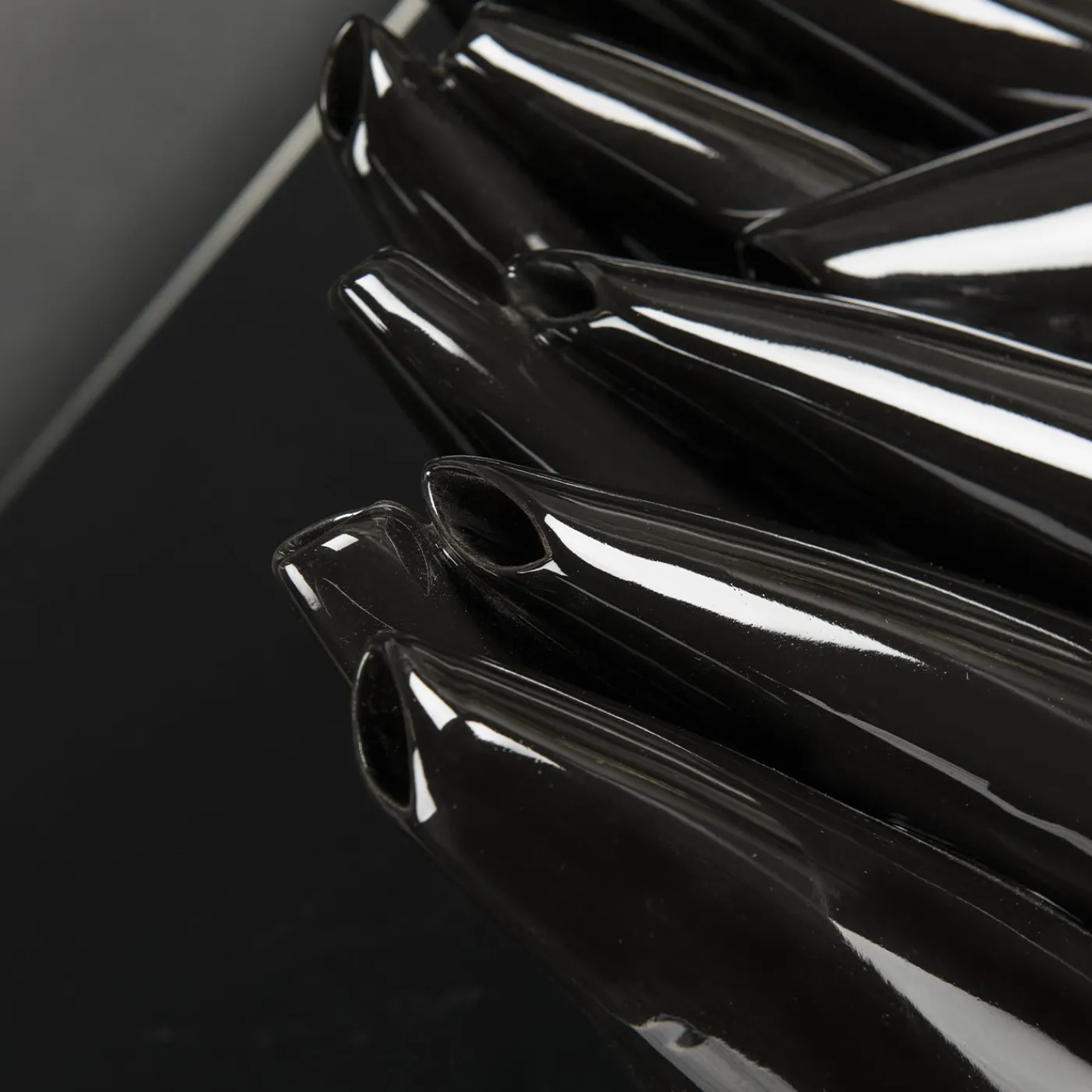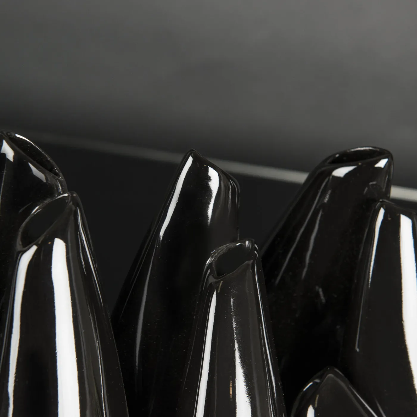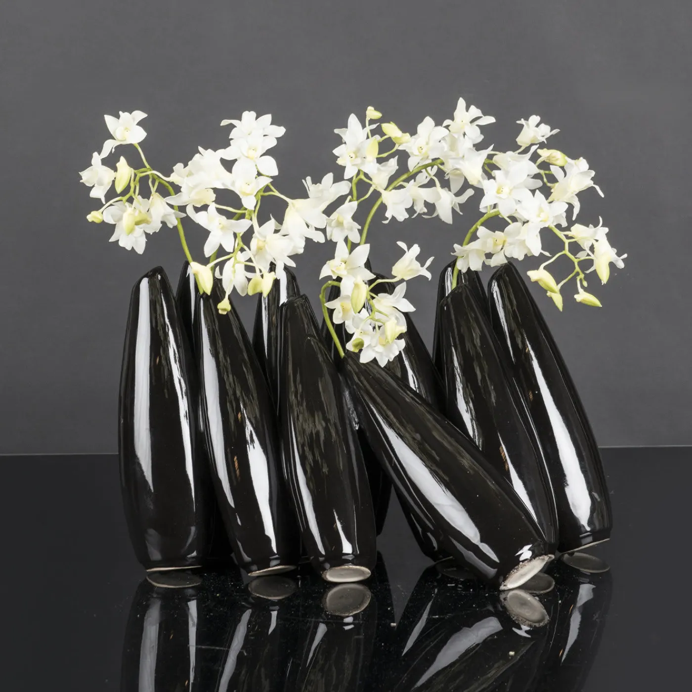 Una composizione scultorea che funge da vaso per una serie di fiori singoli, questo splendido pezzo è il risultato di una lavorazione artigianale dedicata e meticolosa. Realizzato in ceramica laccata nera, è composto da vari elementi in posizione diritta o obliqua, che ricordano i birilli del bowling.