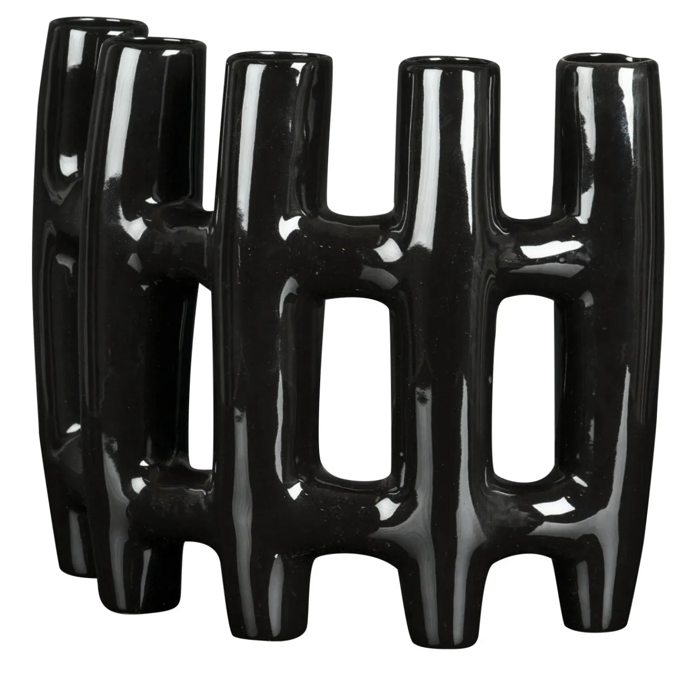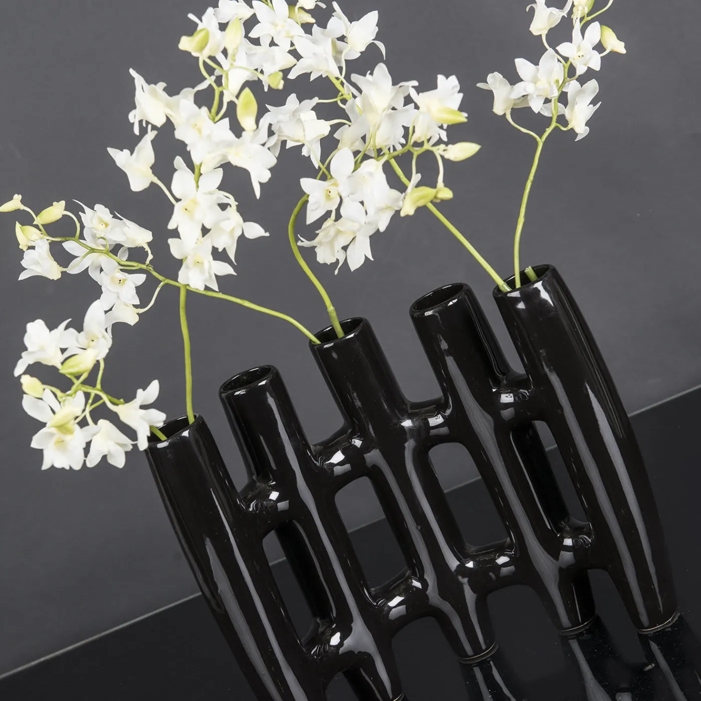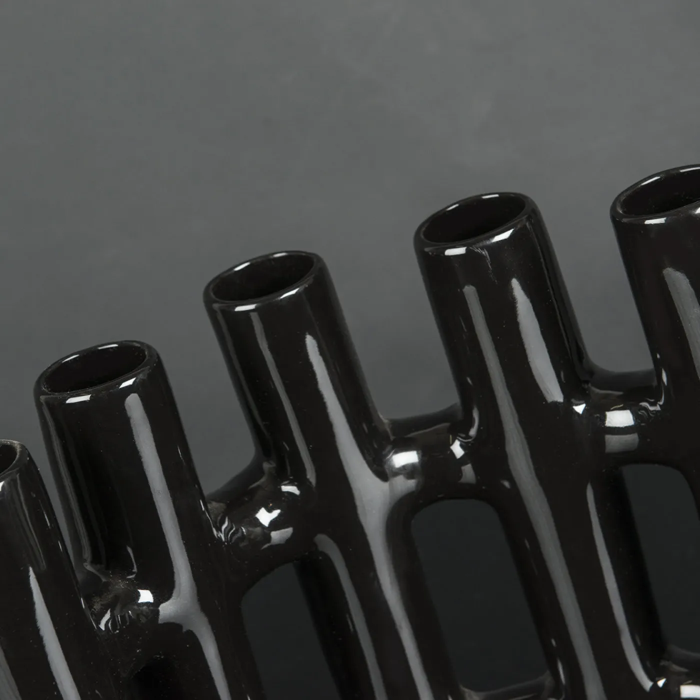 Omaggio al design minimalista, questo vaso per boccioli emana una moderna raffinatezza nella sua tonalità nera lucida e nell’innovativa silhouette geometrica. Realizzato a mano in porcellana laccata nera, presenta la forma di una griglia con quattro fori singoli per quattro fiori diversi.