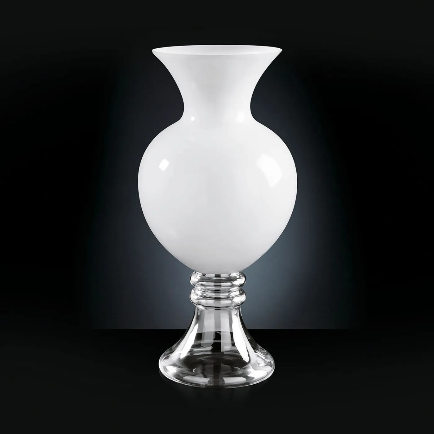 Splendida vetrina di artigianato, questo splendido vaso luminoso ricorda la classica silhouette di un’anfora. È composto da una base a campana in vetro trasparente, che contrasta elegantemente con il vetro bianco opaco del corpo rotondo e capiente. La parte superiore con bordi svasati richiama la forma a campana della base.