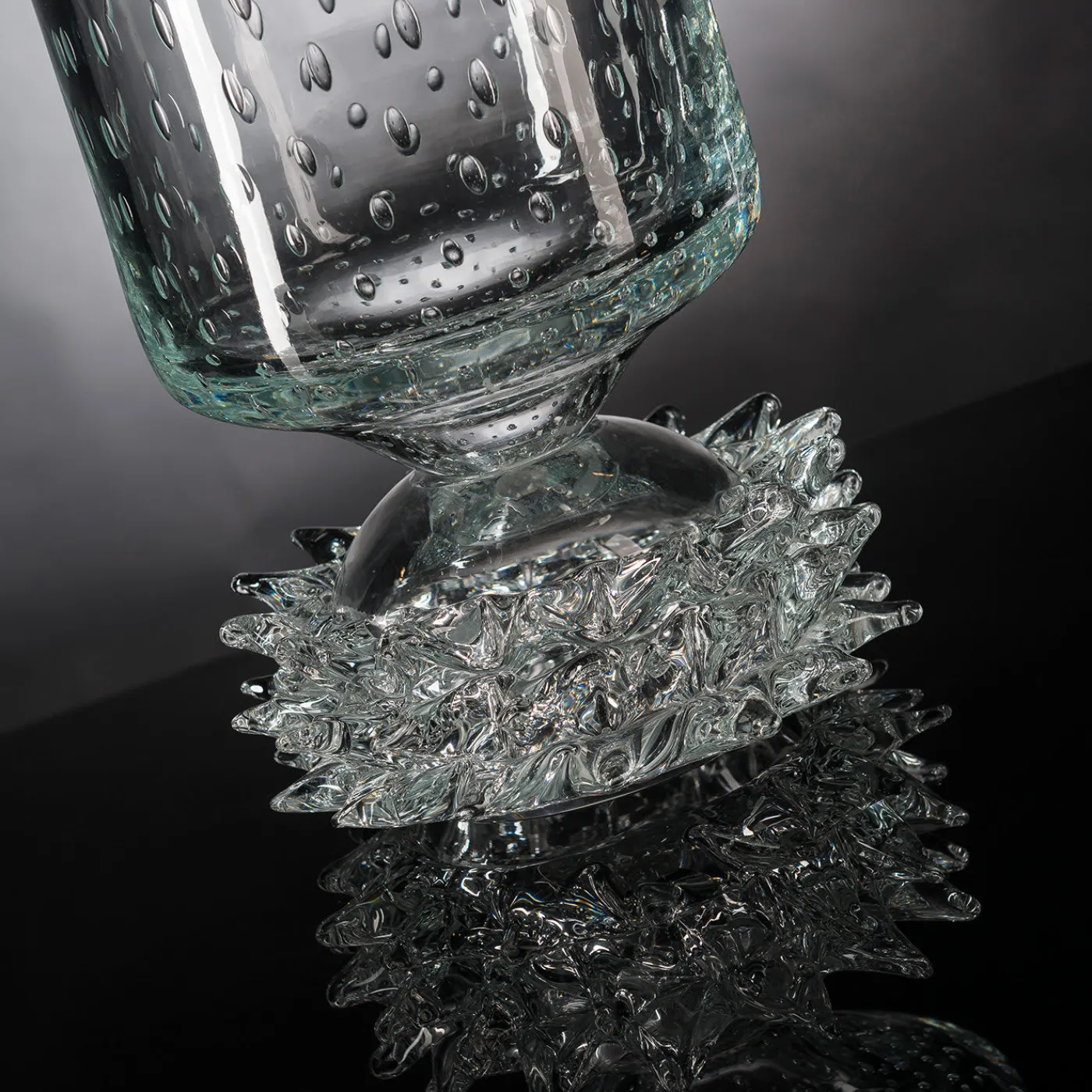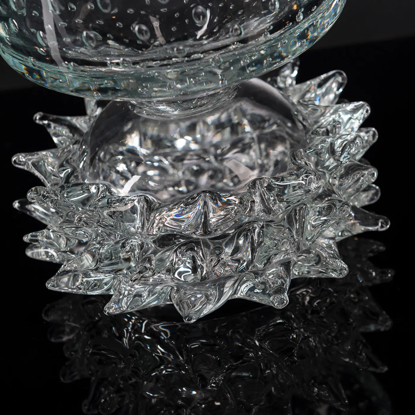 Questo squisito vaso di vetro alto (38 cm) sarà un’aggiunta singolare a un interno moderno, esposto da solo come centrotavola o insieme ad altri della stessa serie per creare un elegante set da pranzo. Caratterizzato da una base raffinata di forte valore testuale, il pezzo è realizzato a mano in vetro strutturato di Murano.