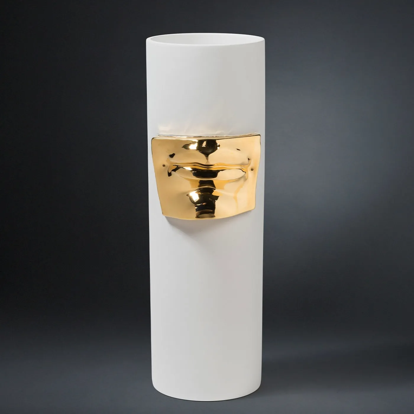 Rivelando la sottile eleganza dell’arte e dell’artigianato italiano, questo splendido vaso vanta un fascino elegante e raffinato. Caratterizzato da un’elegante silhouette cilindrica, è magistralmente realizzato a mano in ceramica bianca e presenta un magnifico bassorilievo raffigurante le labbra del David di Michelangelo placcato in oro 24 carati.