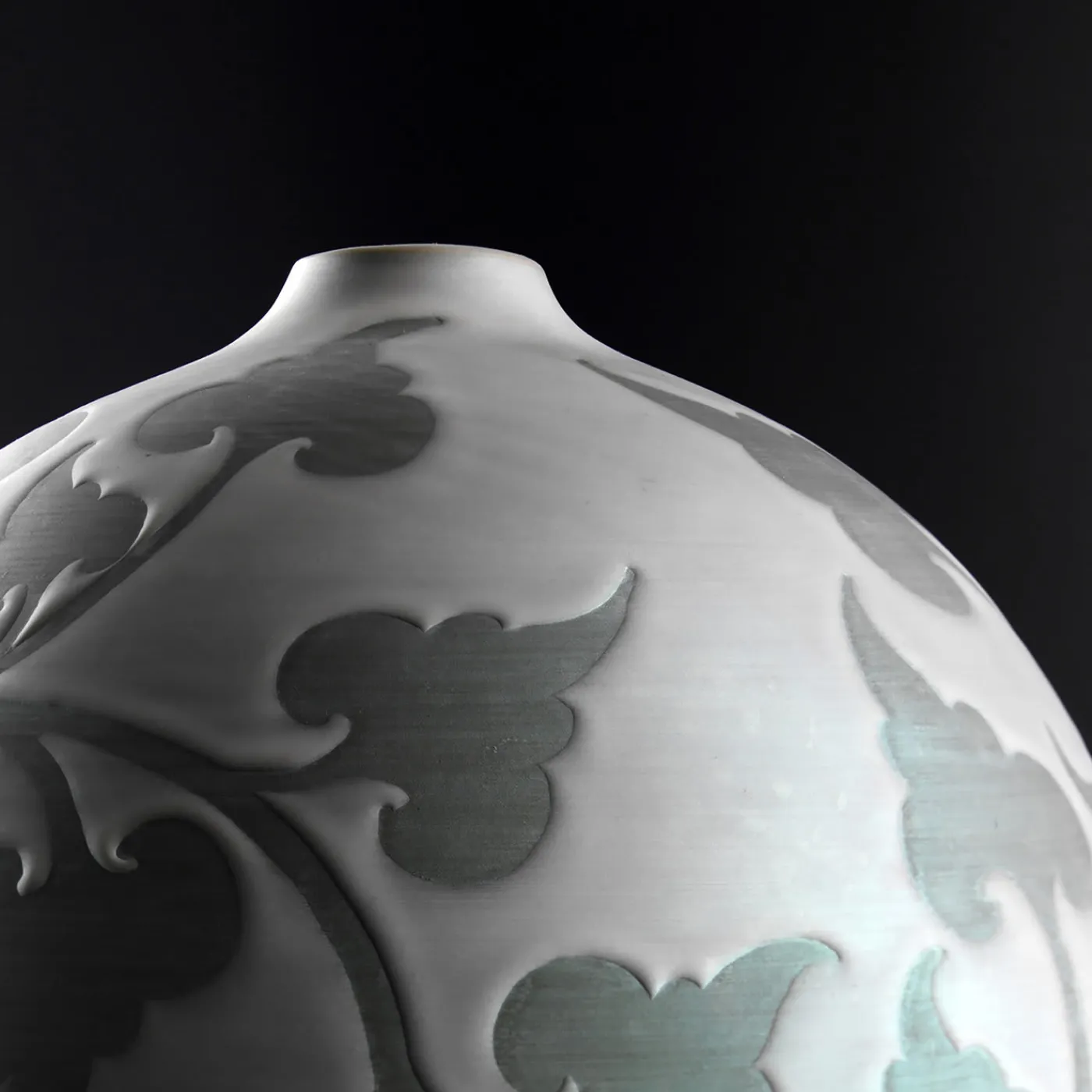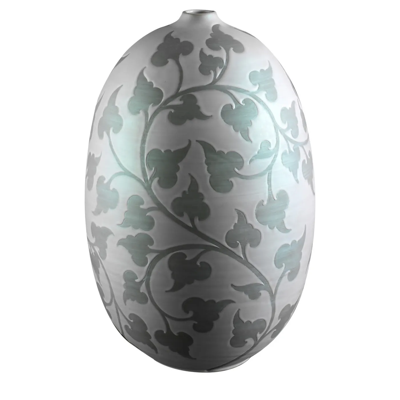 Questo vaso, che ricorda il fascino metallico dei tessuti damascati, emana una raffinata ricercatezza nel suo design unico e contemporaneo. Realizzato squisitamente a mano in ceramica bianca, vanta una forma a oliva ornata da una decorazione floreale caratterizzata da una finitura metallica verde salvia.