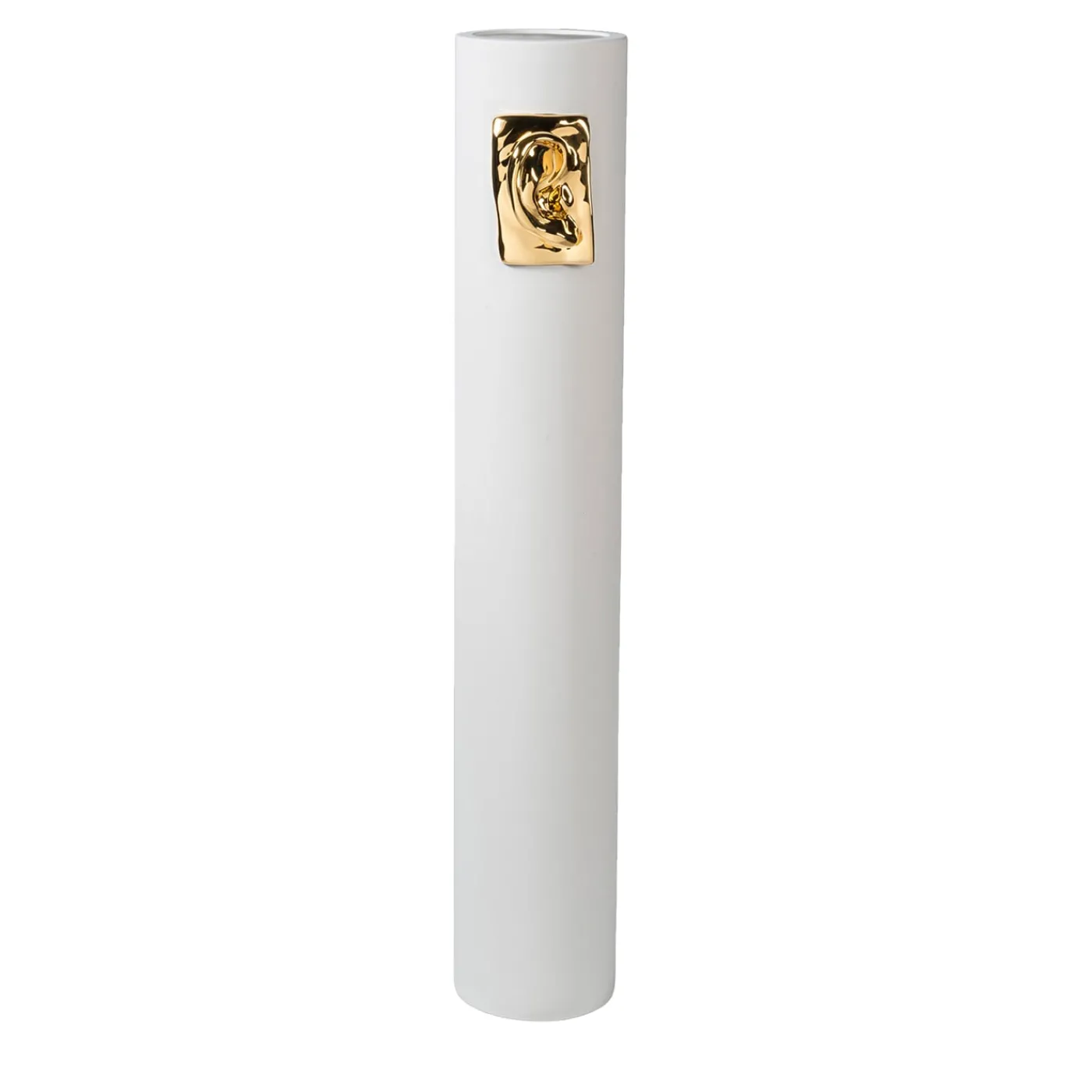 Realizzato a mano in ceramica, questo stupendo vaso decorativo aggiungerà un accento maestoso e iconico a un interno contemporaneo. Dal design moderno, si ispira alla scultura classica italiana. Rifinito in bianco opaco, è impreziosito da un orecchio scolpito a mano in oro 24k lucido. Questo pezzo infonderà senza sforzo un tocco di raffinatezza in interni moderni e minimalisti.