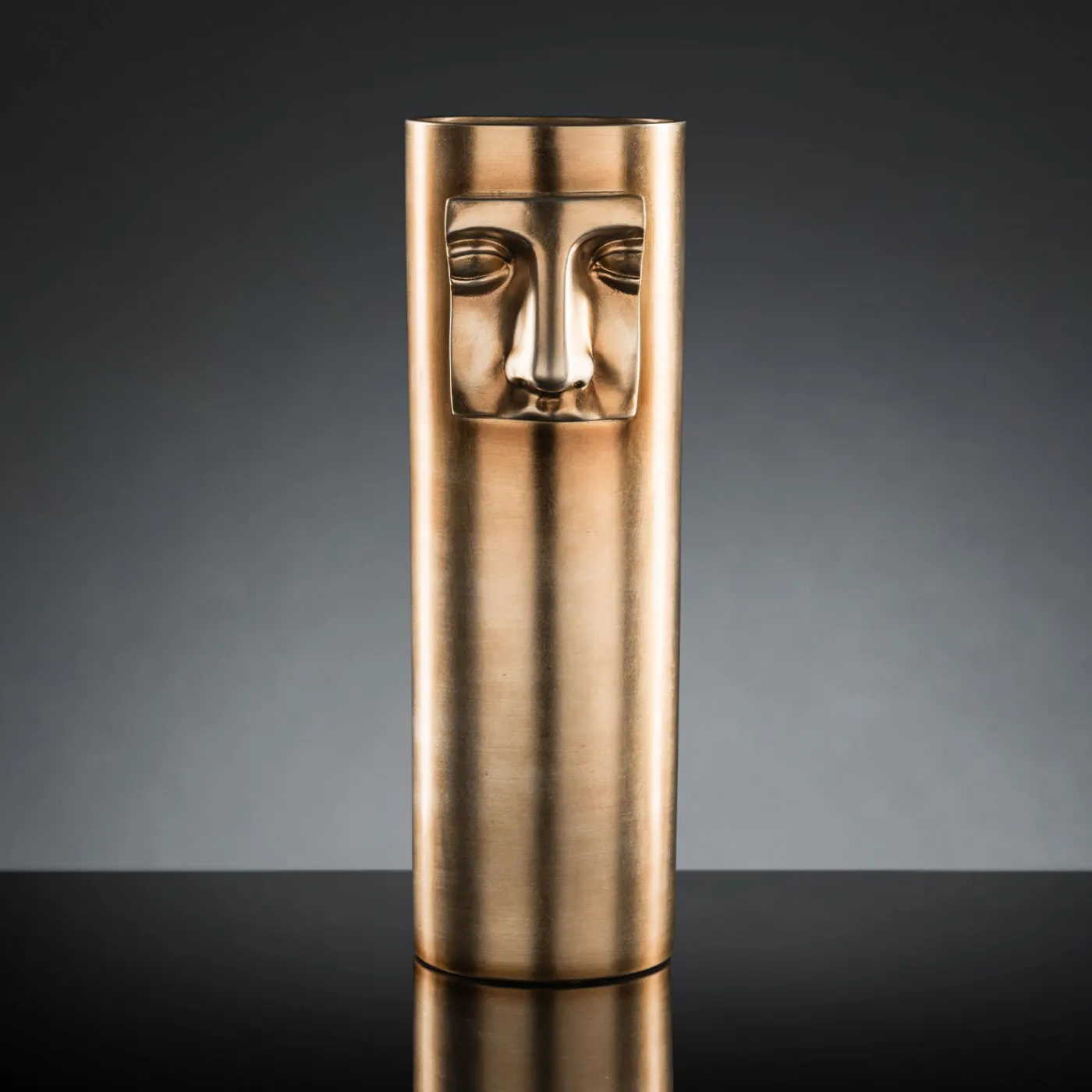 Questo squisito vaso decorativo infonderà un’aura unica e sofisticata in un salotto o in un ingresso contemporaneo. Realizzato a mano in ceramica e rifinito in ottone metallizzato, questo pezzo cilindrico è arricchito da un sorprendente bassorilievo che raffigura un primo piano del volto della dea romana Giunone.