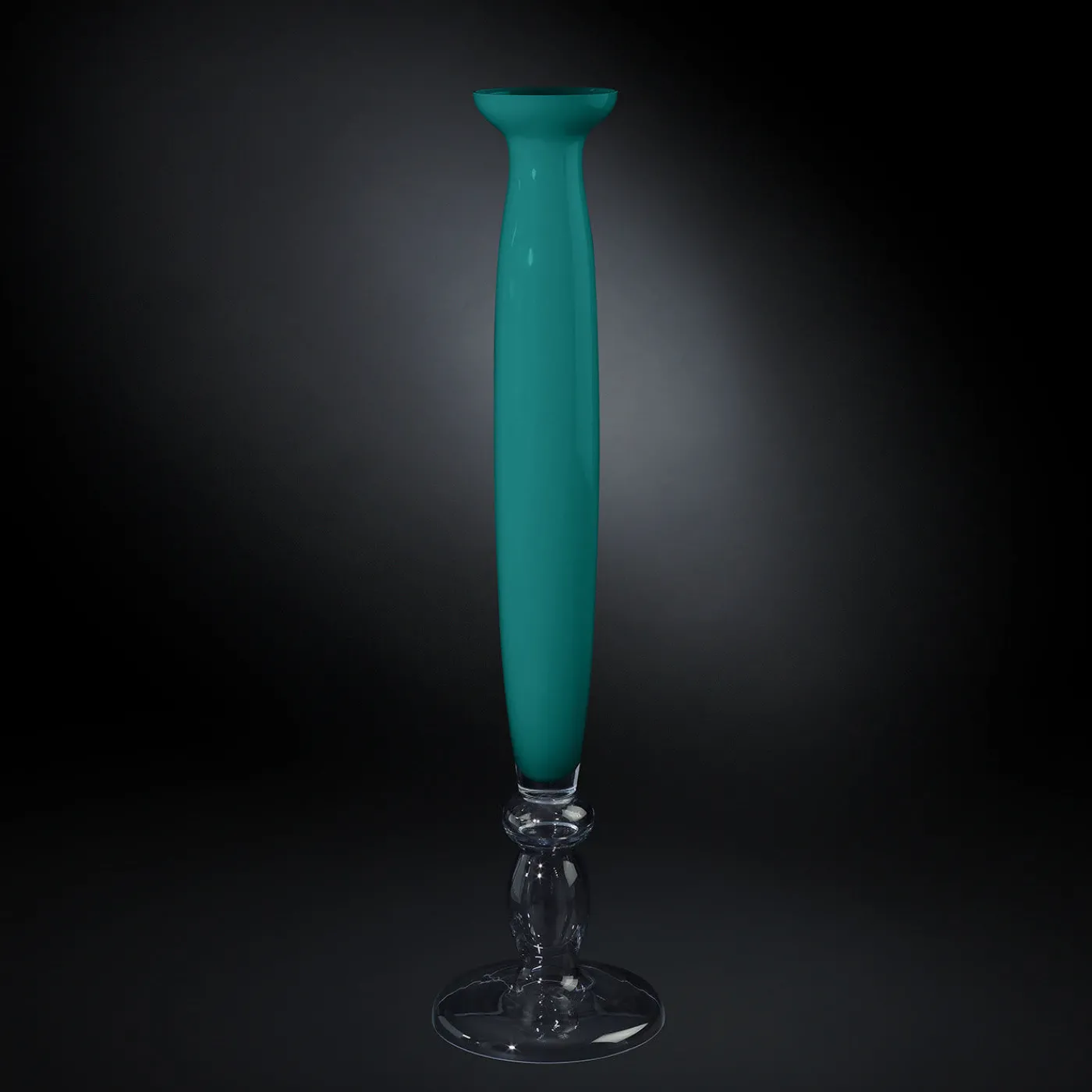 Questo raffinato vaso in vetro è realizzato a mano con tecniche artigianali tradizionali che gli conferiscono una qualità liscia e lucida. Con una silhouette moderna impreziosita da una squisita combinazione di vetro verde laguna trasparente e opaco, sfoggia un profilo sinuoso e slanciato, perfetto per una composizione a due o tre fiori.