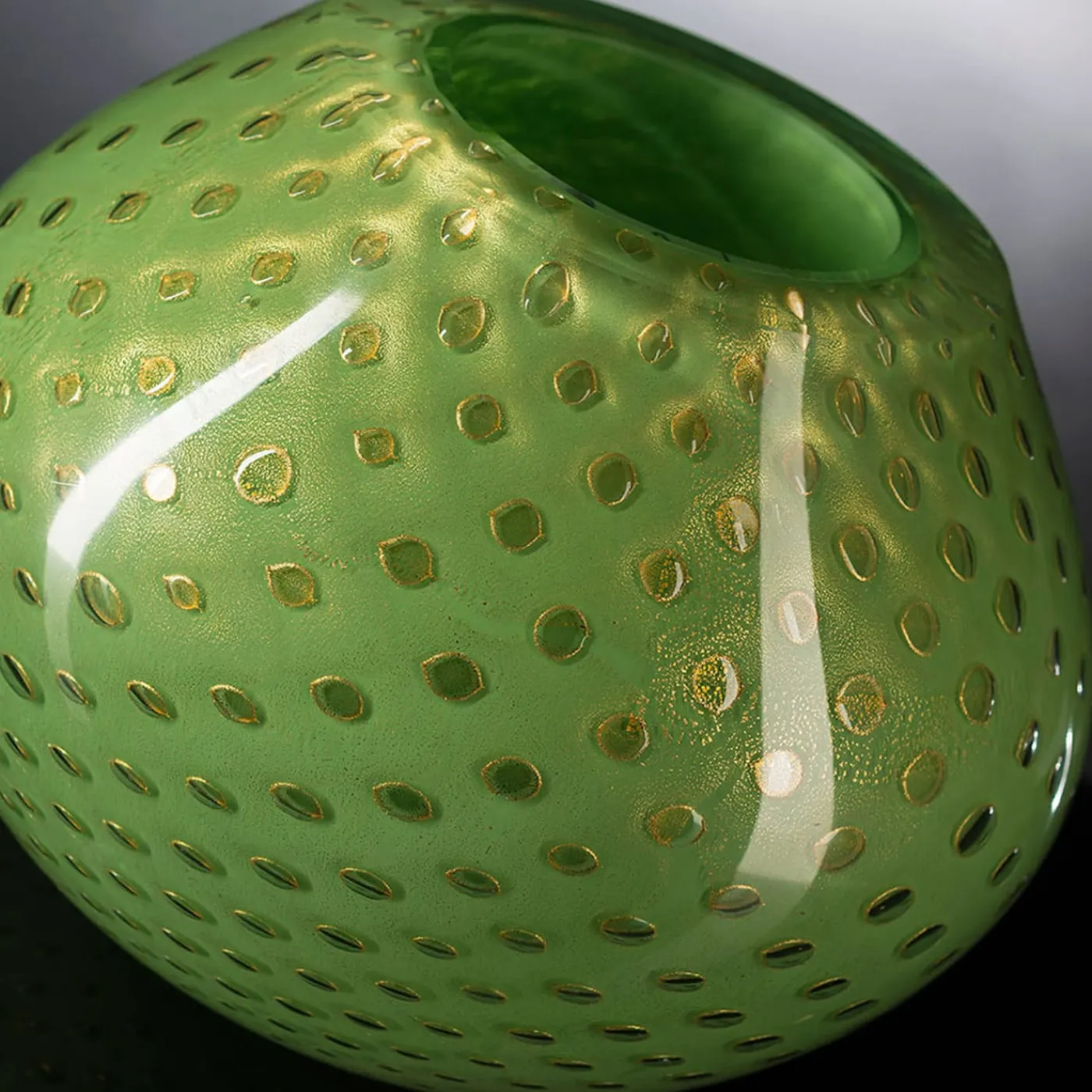 Un’invitante forma rigonfia che si assottiglia verso l’imboccatura contraddistingue questo singolare vaso, progettato per completare con classe senza tempo ambienti domestici o banchetti speciali. Sapientemente soffiato a bocca in vetro di Murano verde, presenta un vivace disegno di punti dorati che creano splendidi bagliori, soprattutto se colpiti dalla luce. Per ulteriori versioni, consultare il catalogo Artemest.