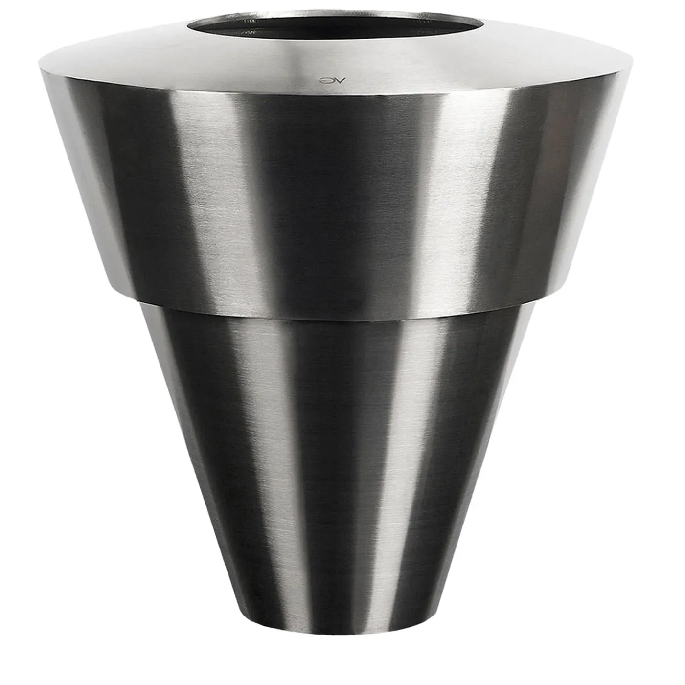 Questo vaso decorativo, realizzato a mano in acciaio satinato e caratterizzato da una piccola forma conica che si apre nella parte superiore, è perfetto da inserire nello stile di uno spazio nuziale, di un evento speciale o di un arredamento domestico. Disponibile in una variante più alta, può essere combinato per ottenere un look elegante e luminoso.